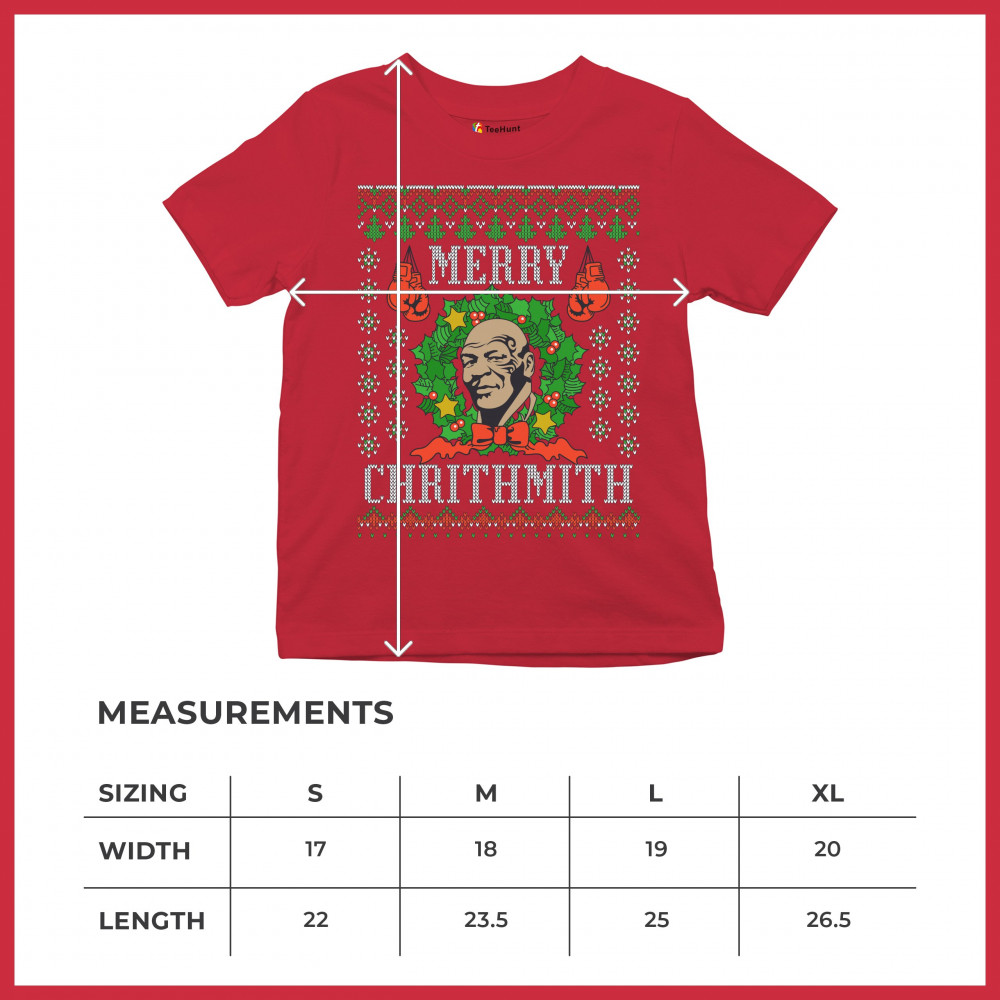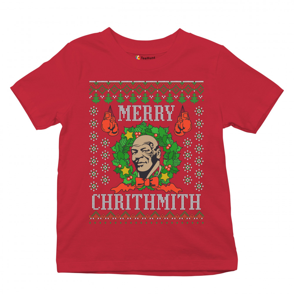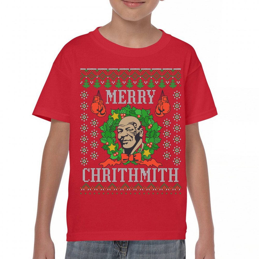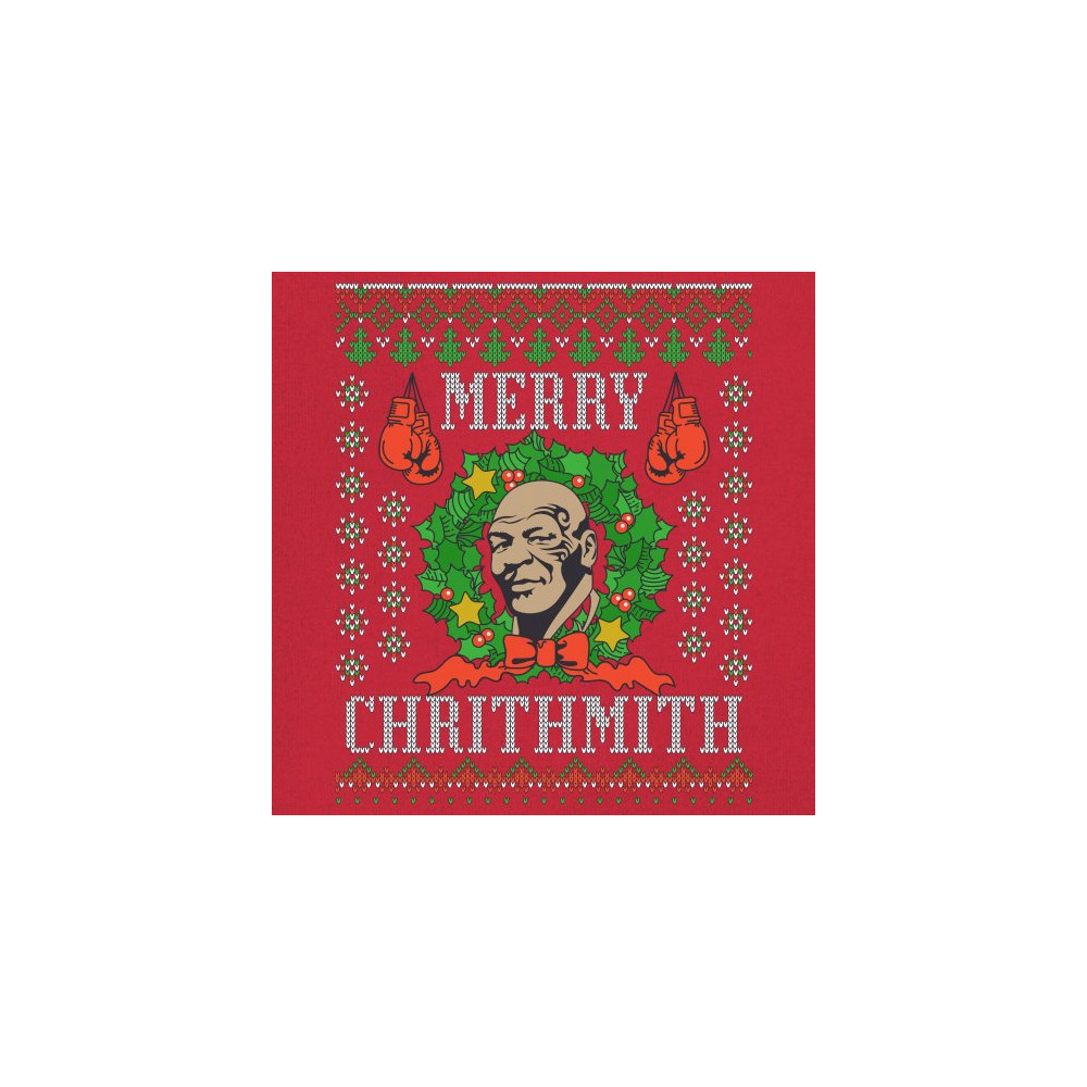 A print saying: "Merry Chrithmith" and featuring the face of Mike Tyson inside of a Christmas chaplet and two pairs of boxing gloves. The print is designed as an ugly sweater. Amazing choice to make people smile and spread positive vibes on Christmas Eve.