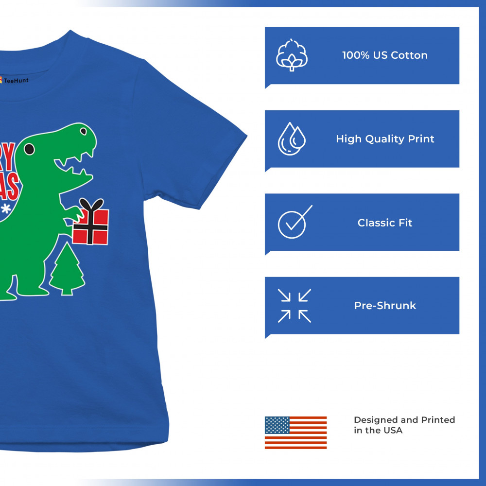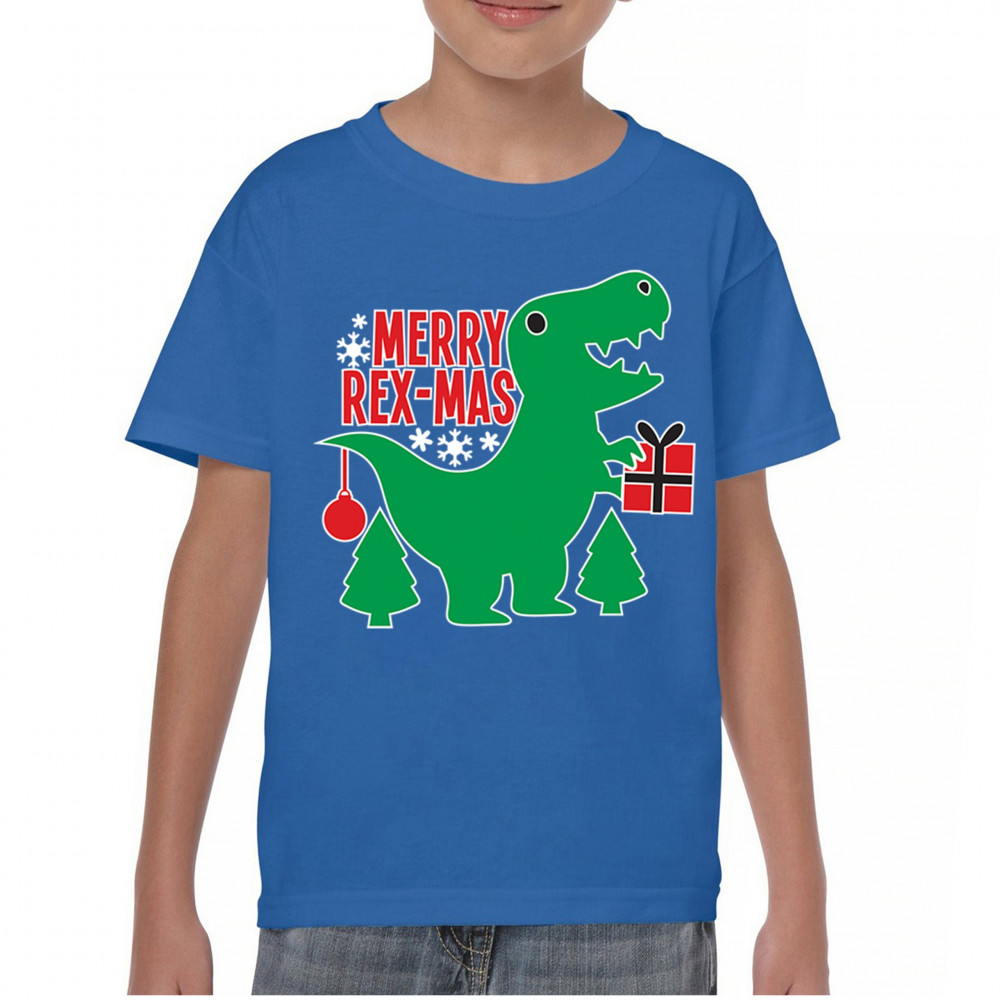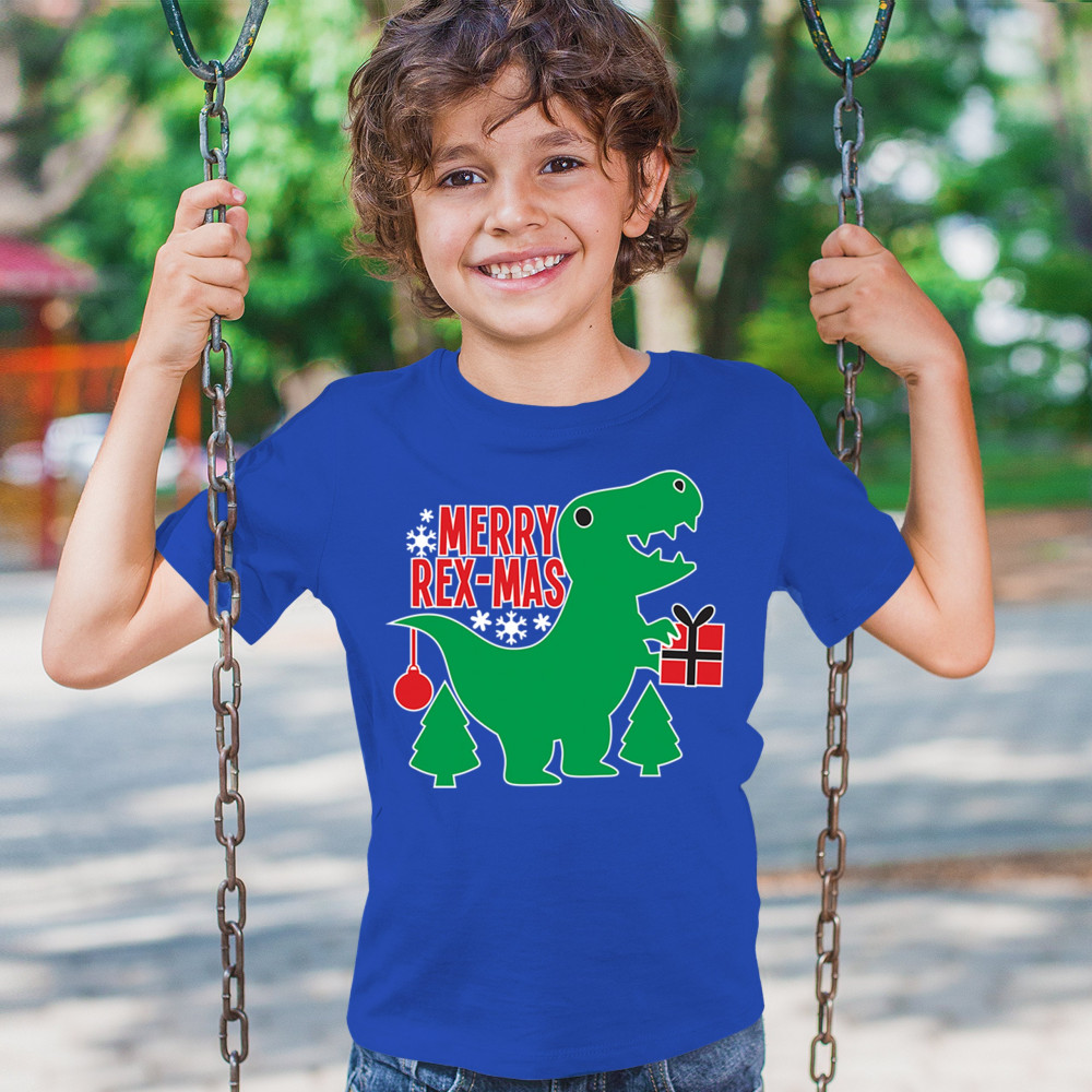 Merry Rex-Mas dinosaur Christmas design with a cute T-Rex, gift, and festive holiday details. Perfect for fun family celebrations and cheerful winter style.