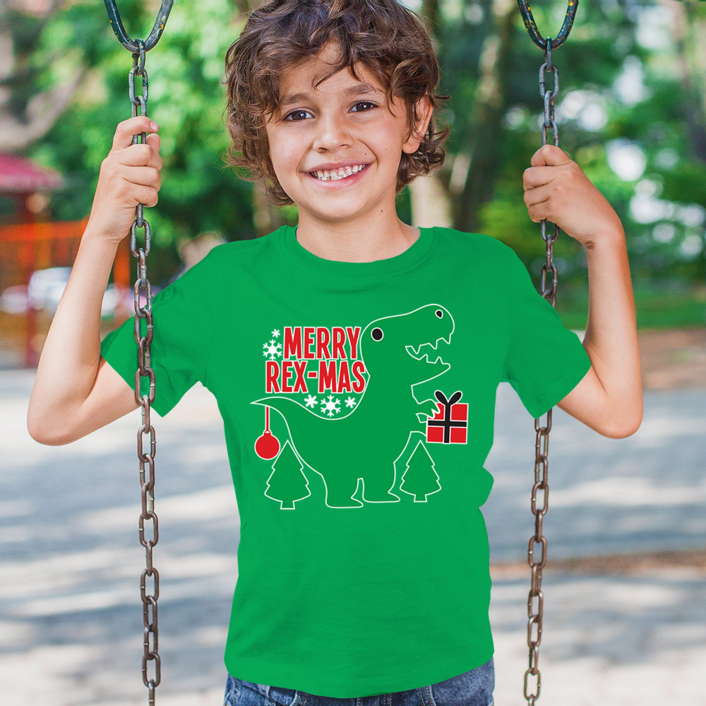 Merry Rex-Mas dinosaur Christmas design with a cute T-Rex, gift, and festive holiday details. Perfect for fun family celebrations and cheerful winter style.