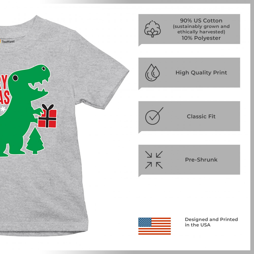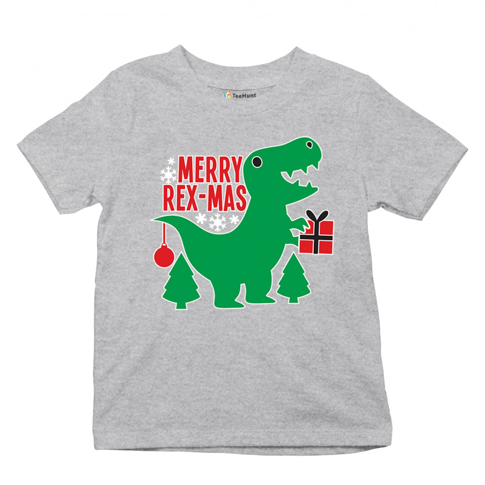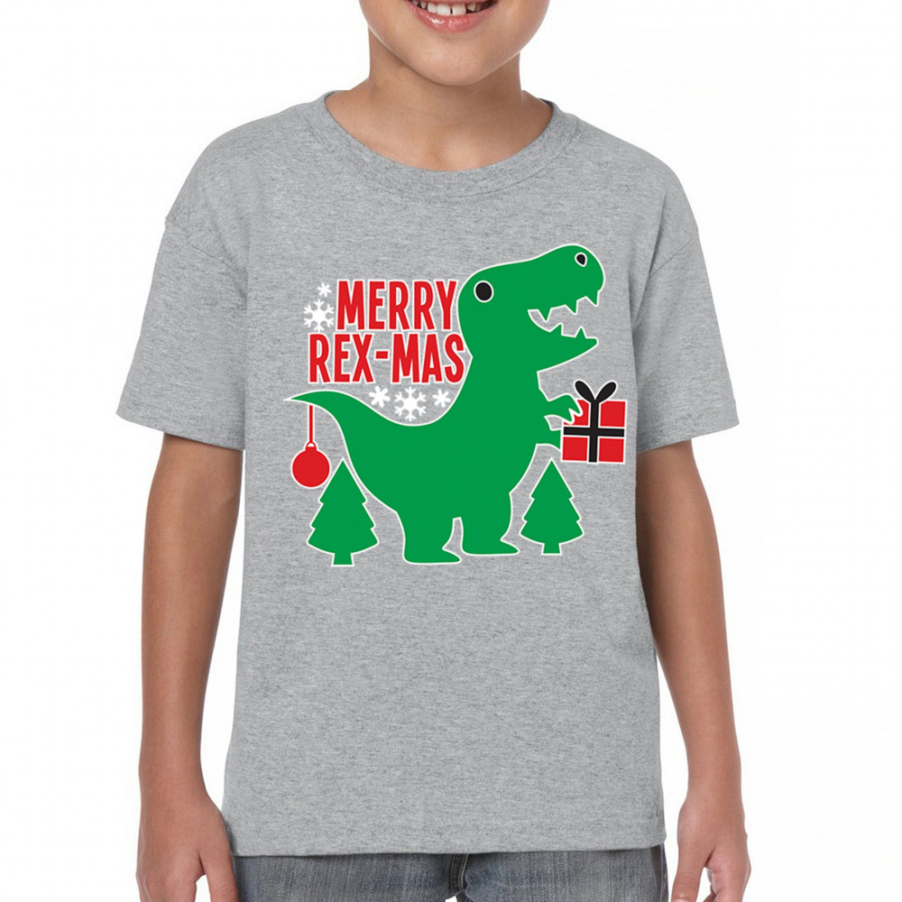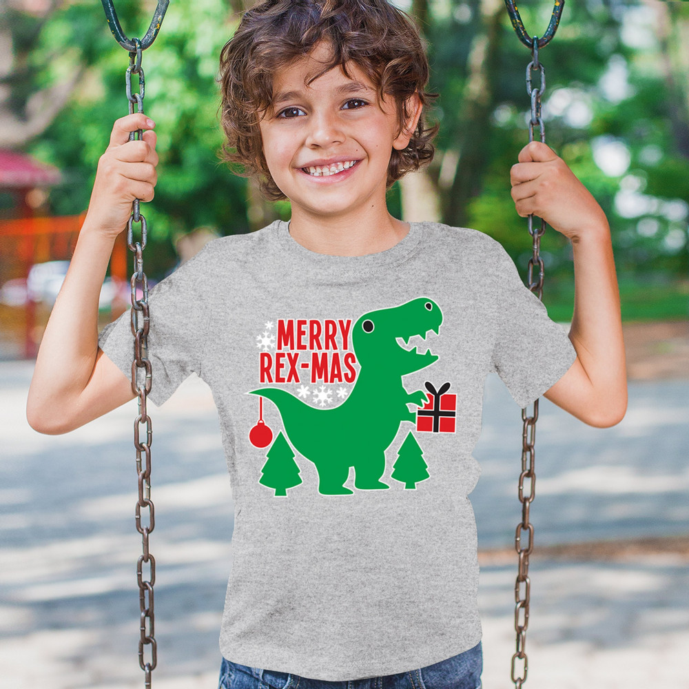 Merry Rex-Mas dinosaur Christmas design with a cute T-Rex, gift, and festive holiday details. Perfect for fun family celebrations and cheerful winter style.