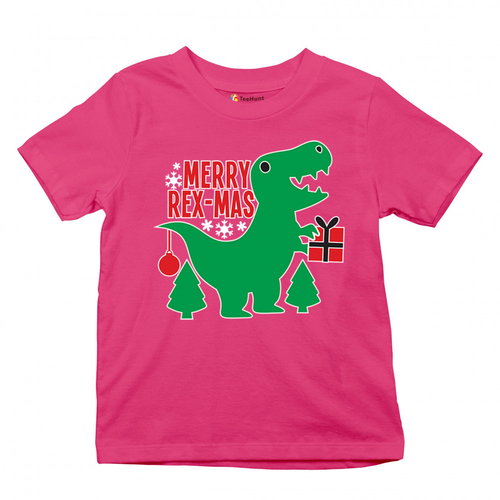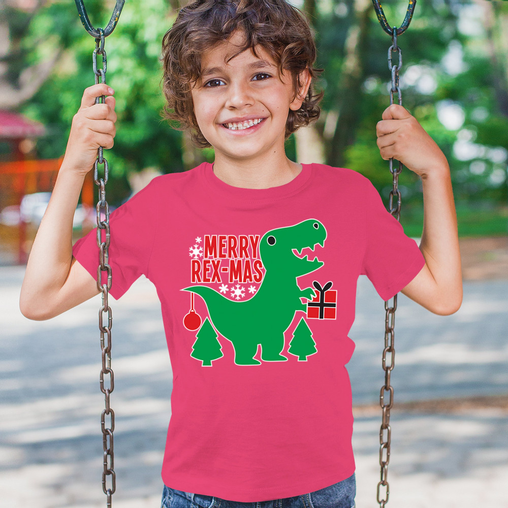 Merry Rex-Mas dinosaur Christmas design with a cute T-Rex, gift, and festive holiday details. Perfect for fun family celebrations and cheerful winter style.