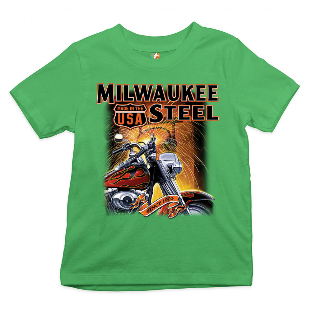 A print featuring a motorcycle in the front and a melting furnace in the background with sparkles flying all over the place. The print says: "Milwaukee Steel". There is also a sign that says "made in the USA" and a stripe with "since 1903" written on it.