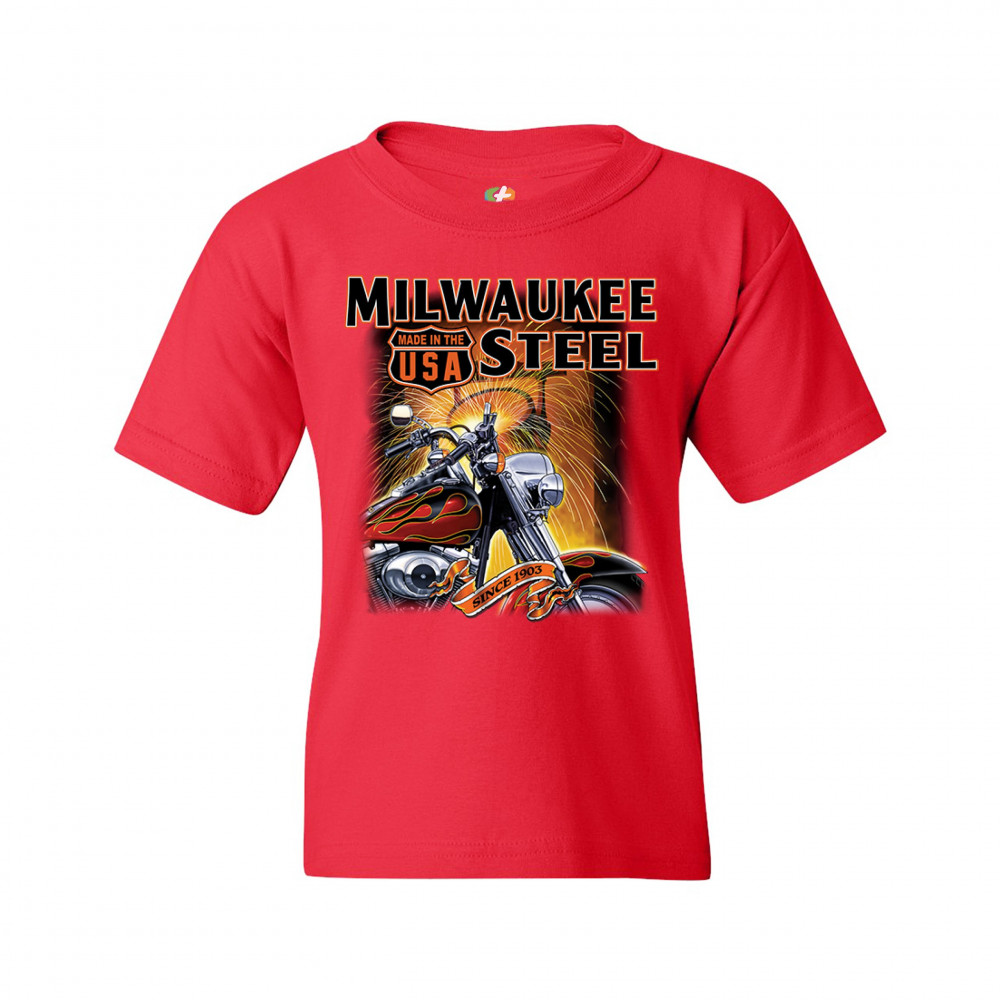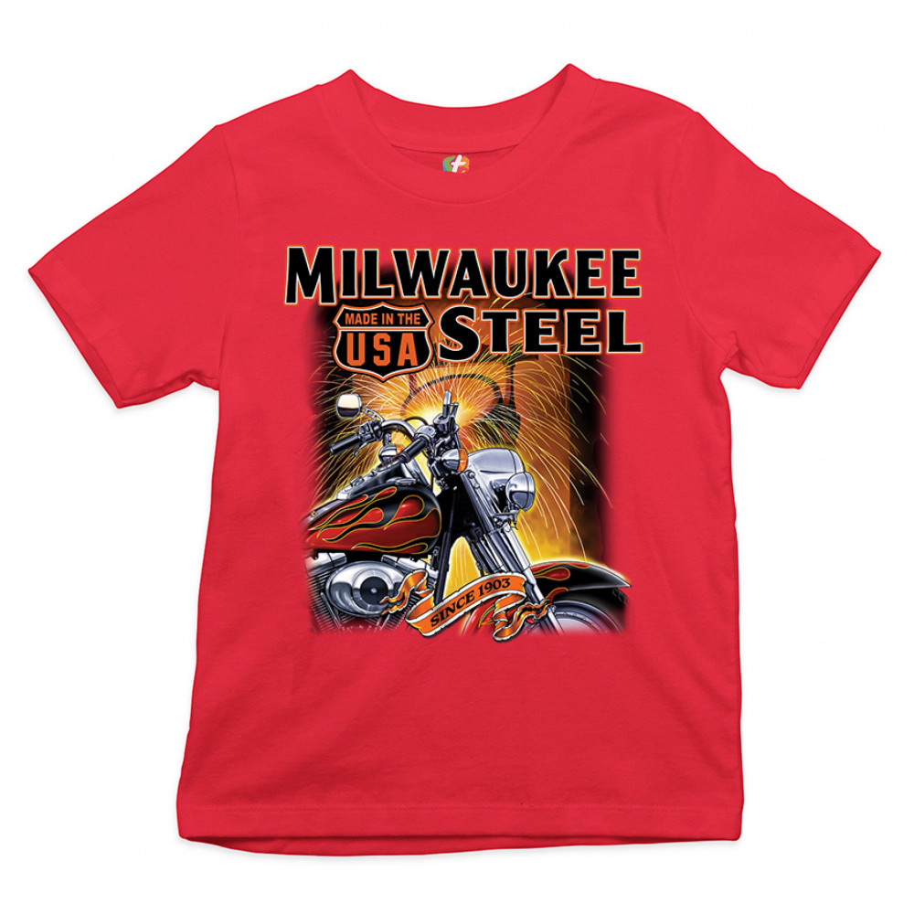 A print featuring a motorcycle in the front and a melting furnace in the background with sparkles flying all over the place. The print says: "Milwaukee Steel". There is also a sign that says "made in the USA" and a stripe with "since 1903" written on it.
