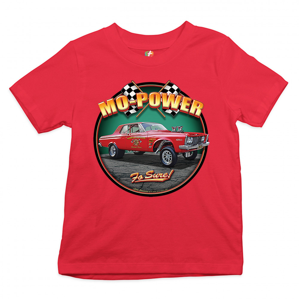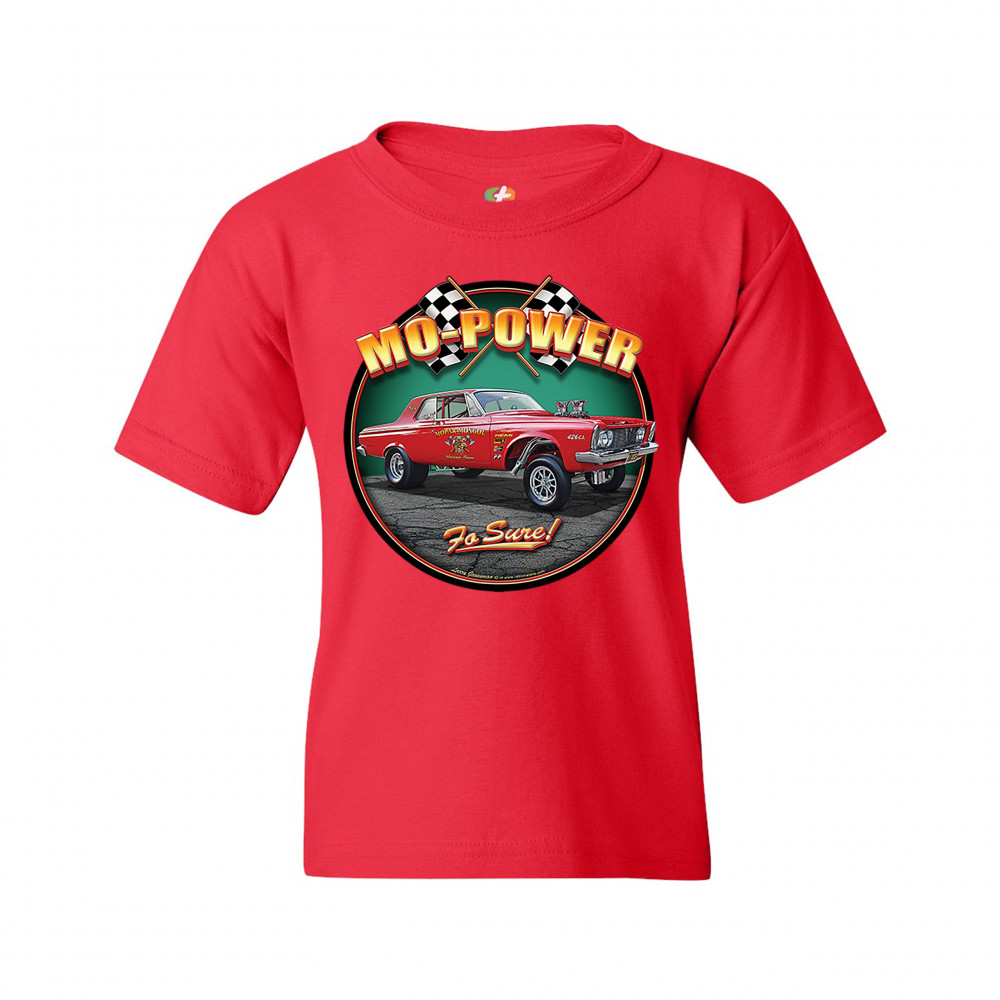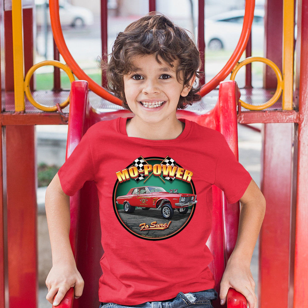 MO-POWER FO SURE! youth t-shirt american muscle car racing route 66 kids red