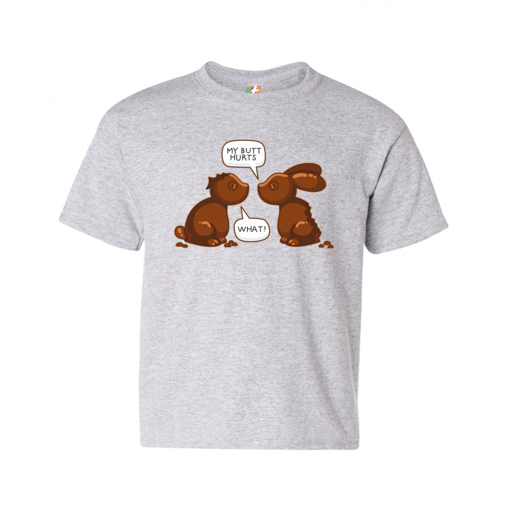 MY BUTT HURTS - WHAT? youth t-shirt chocolate bunnies easter rabbits kids gray