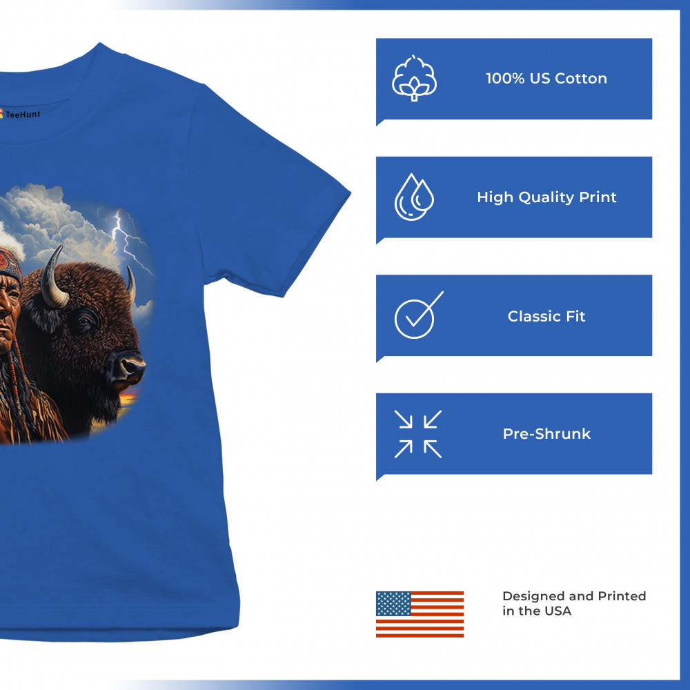 Bold tribal elder and bison design framed by lightning sky—honoring heritage, strength, resilience, and sacred connection to nature.