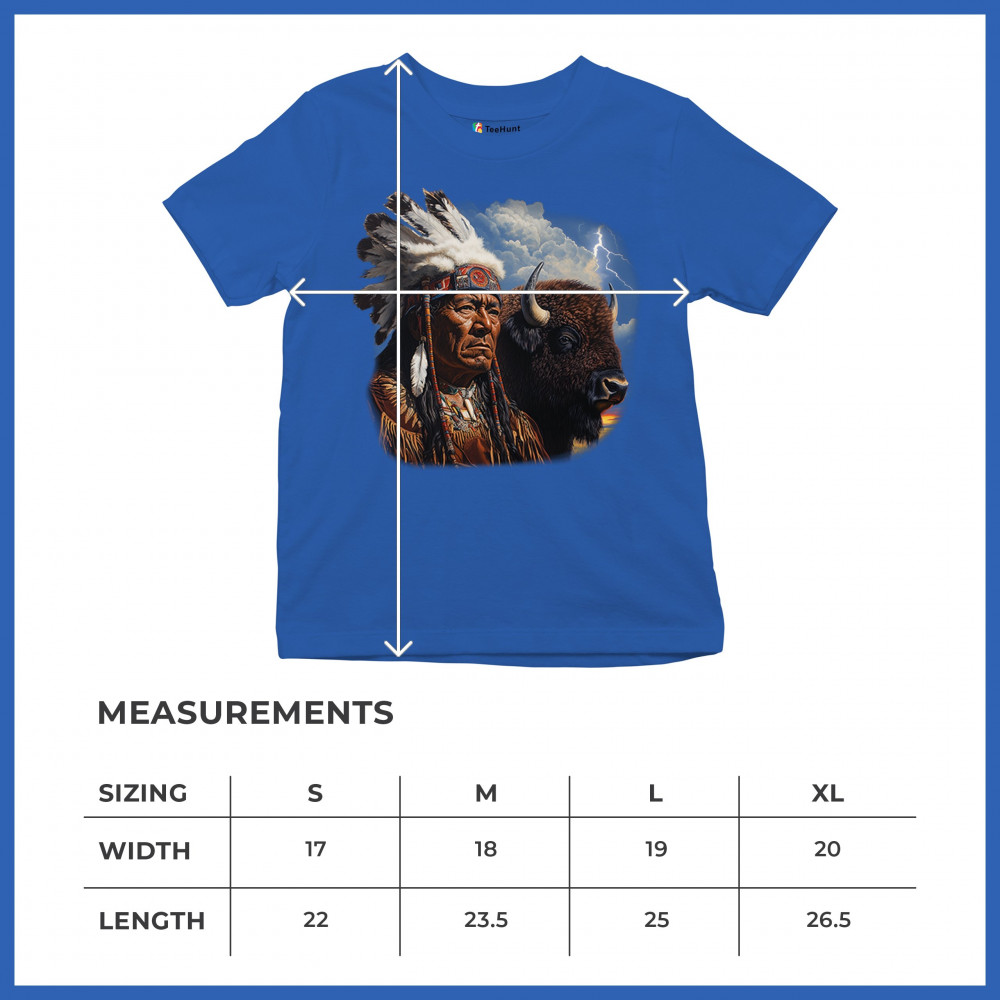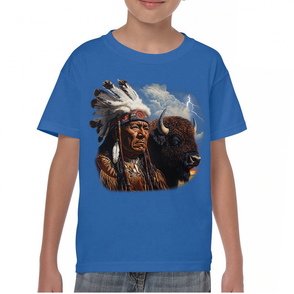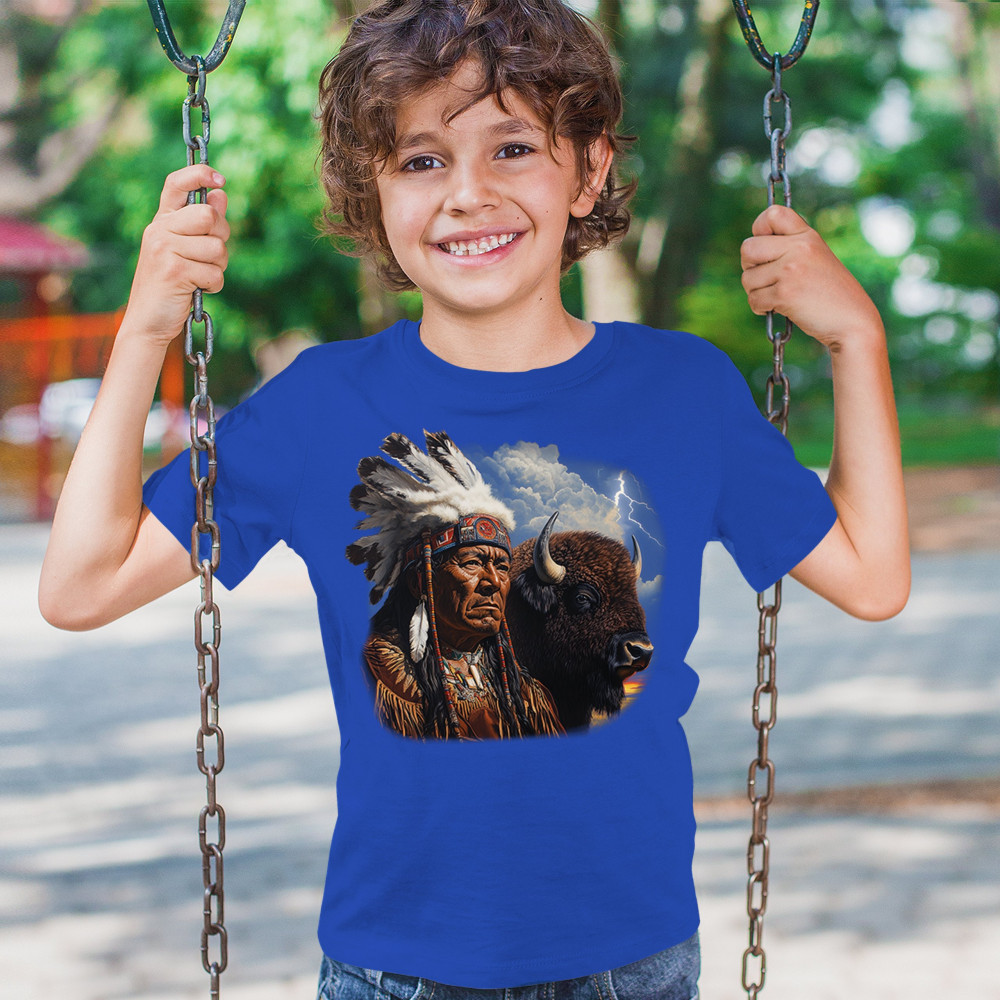 This powerful design features a Native American elder in traditional dress and feathered headdress beside a noble bison. Framed by a stormy sky and lightning, the art symbolizes tribal pride, spiritual harmony, ancestral strength, and a deep connection to nature’s raw energy.