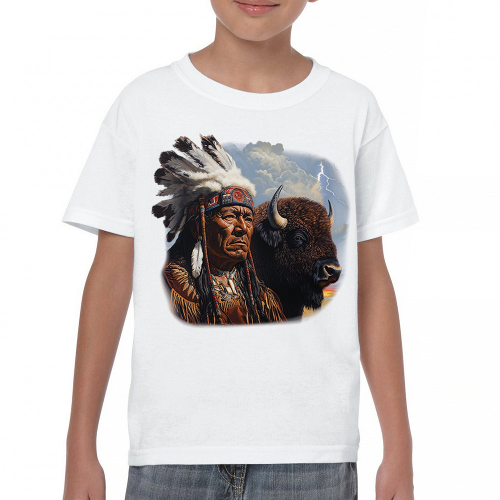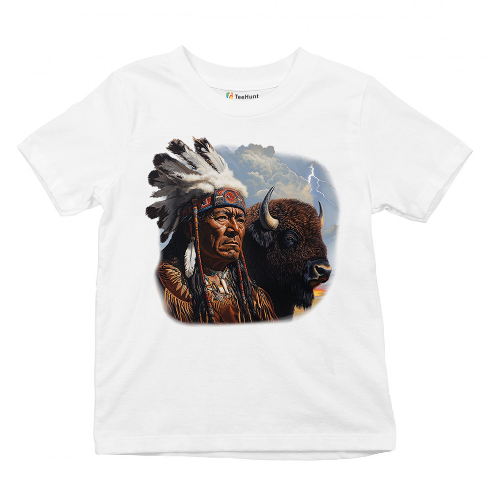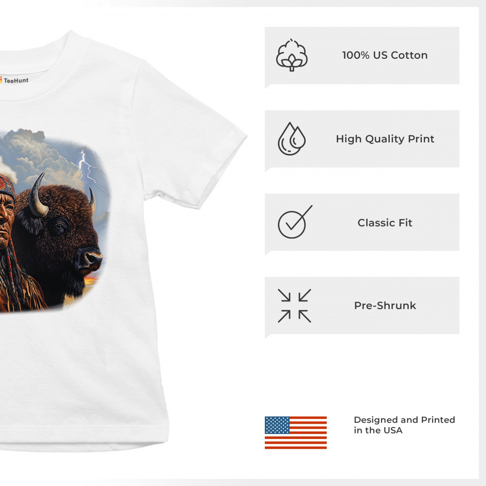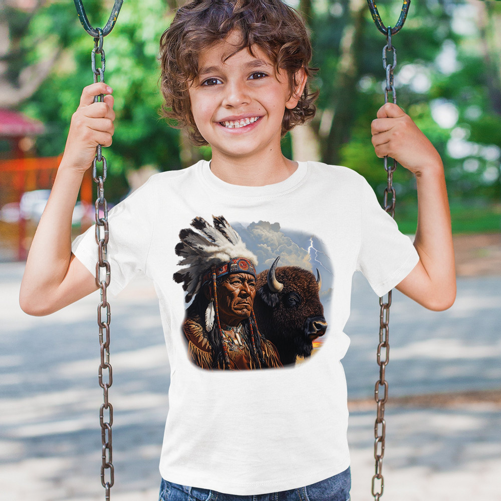 Bold tribal elder and bison design framed by lightning sky—honoring heritage, strength, resilience, and sacred connection to nature.