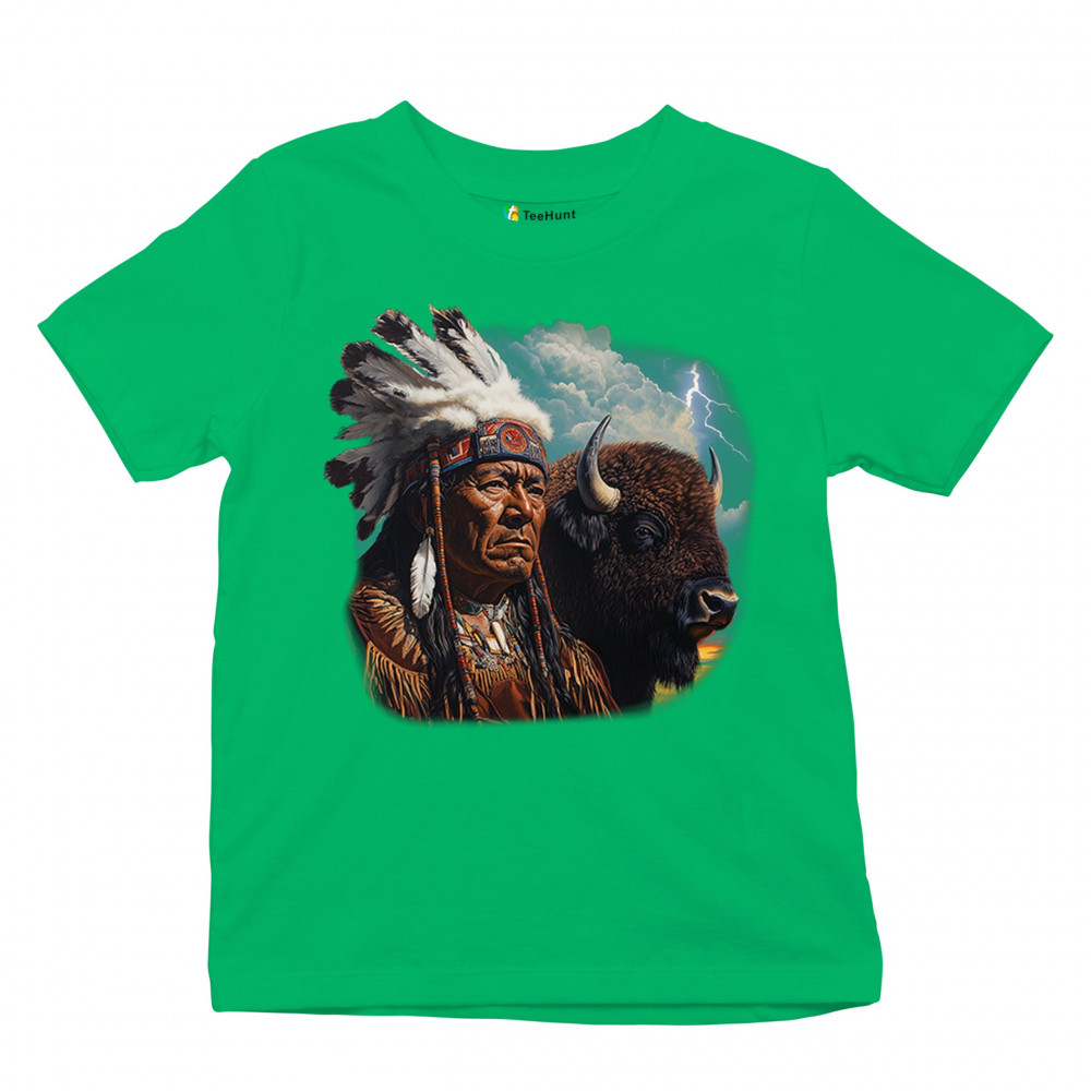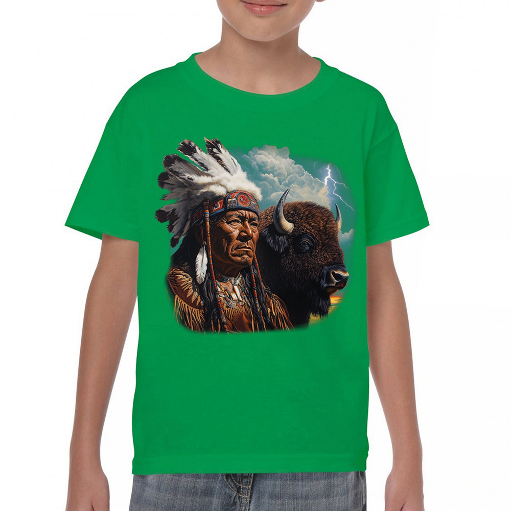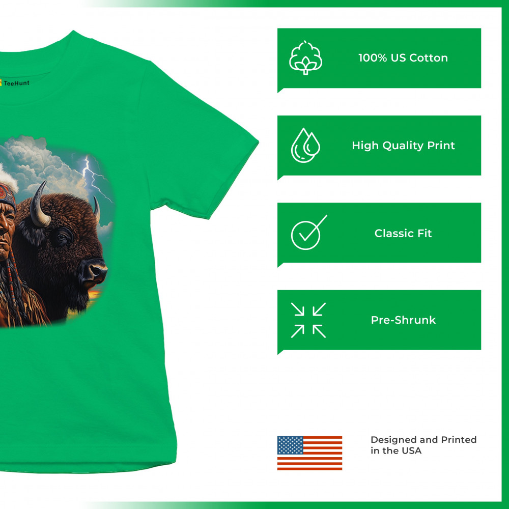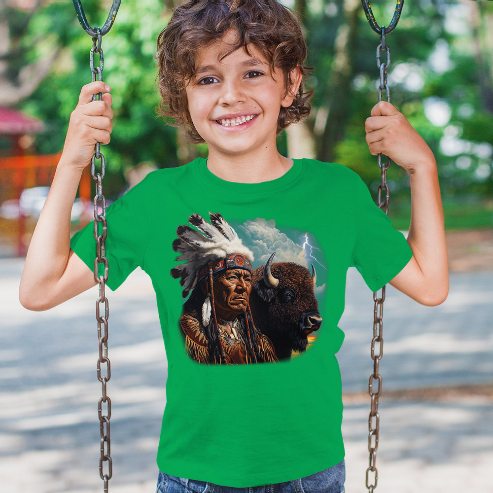 Bold tribal elder and bison design framed by lightning sky—honoring heritage, strength, resilience, and sacred connection to nature.