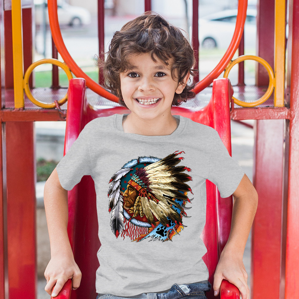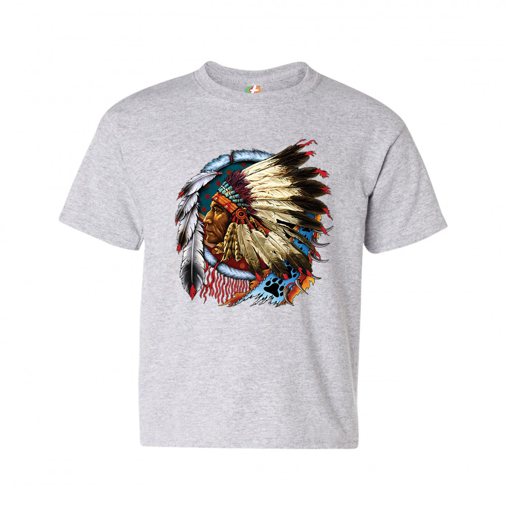 NATIVE AMERICAN CHIEF youth t-shirt war bonnet dreamcatcher indigenous kids gray