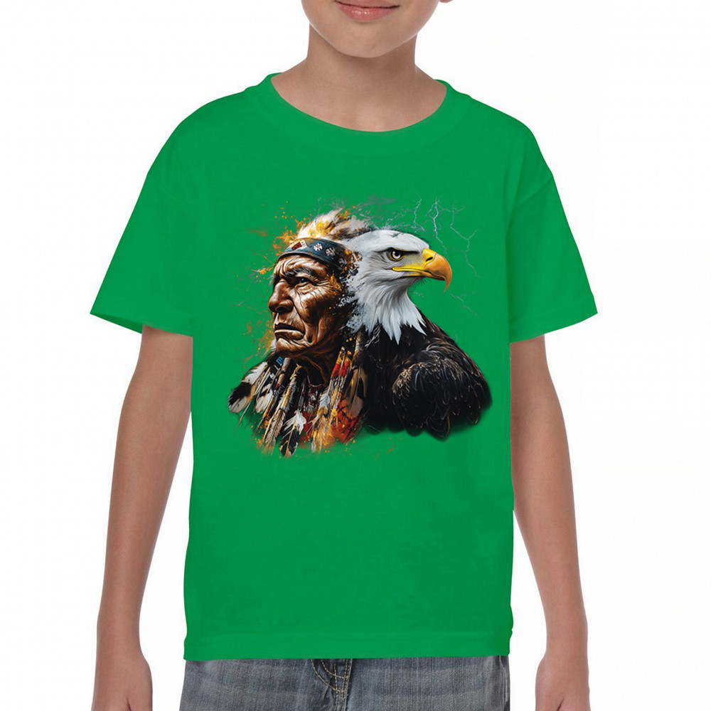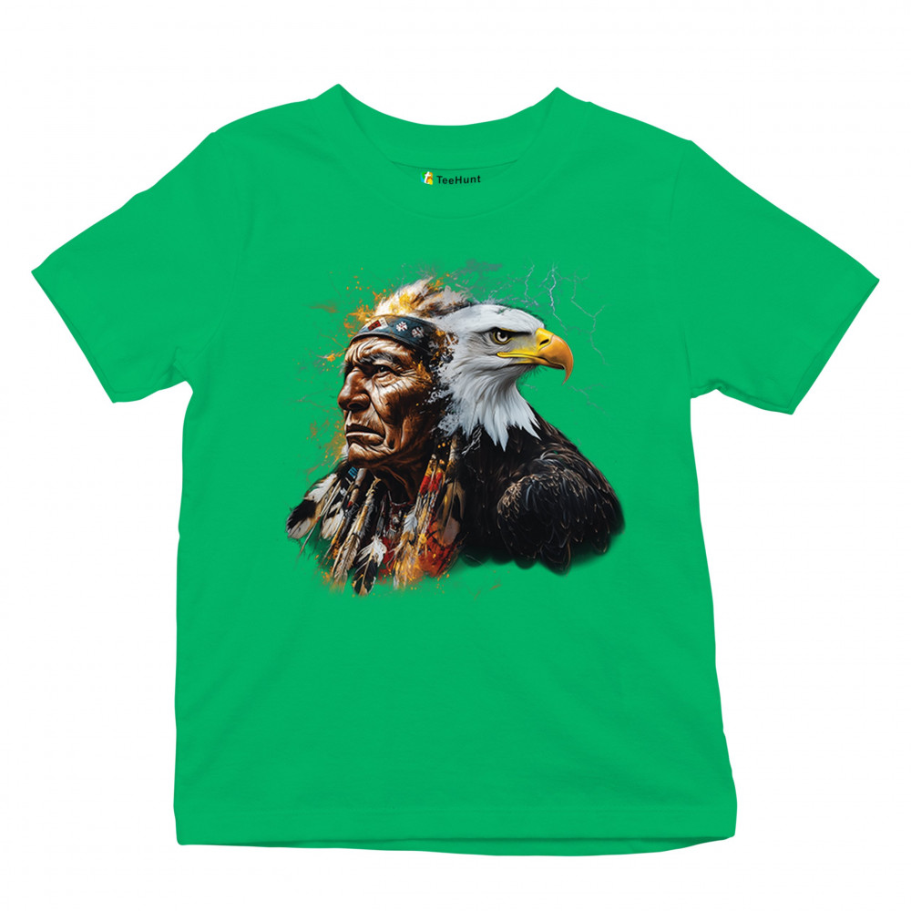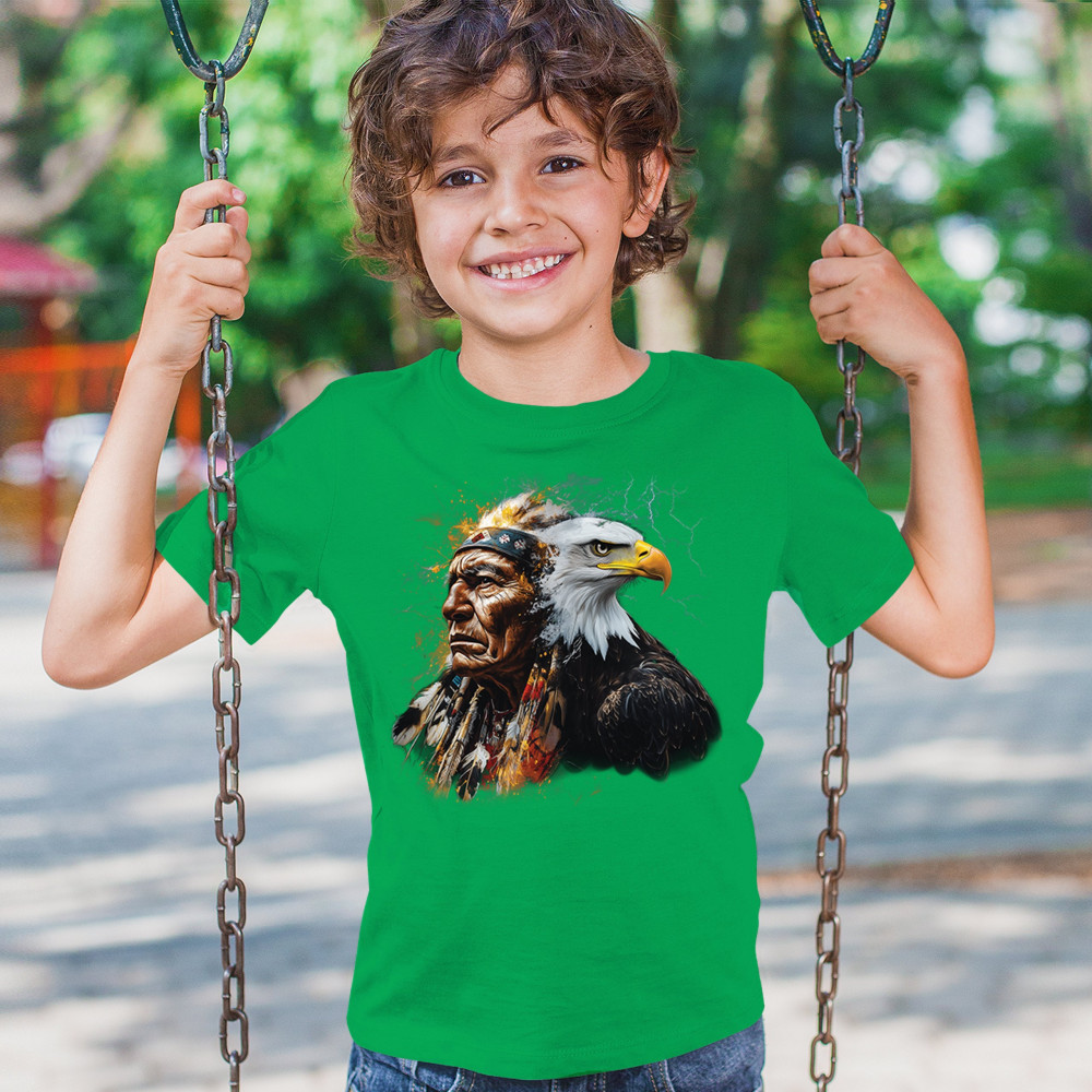 Bold tribal totem design with Native chief, eagle, lightning, and fire. A fierce blend of spirit, power, and cultural pride in one image.