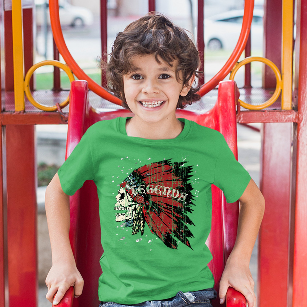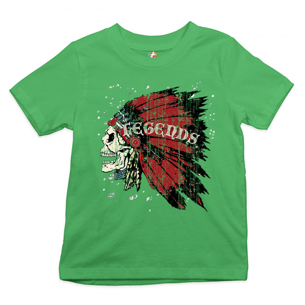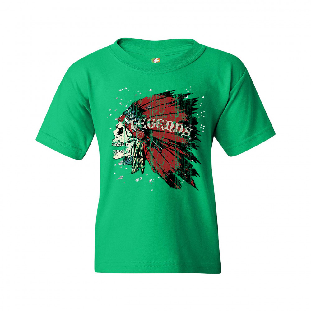 NATIVE AMERICAN LEGENDS youth t-shirt skull face war bonnet headdress kids green