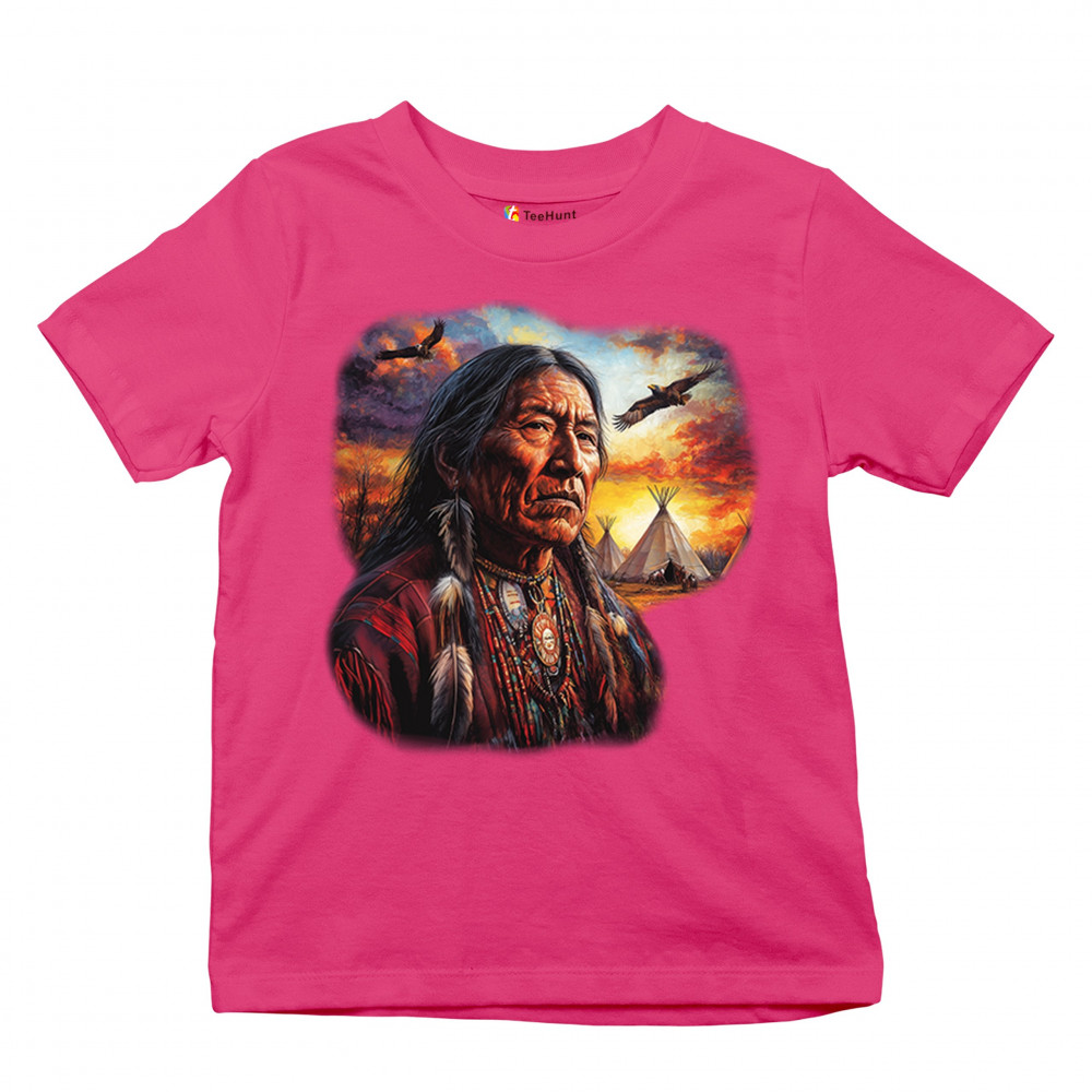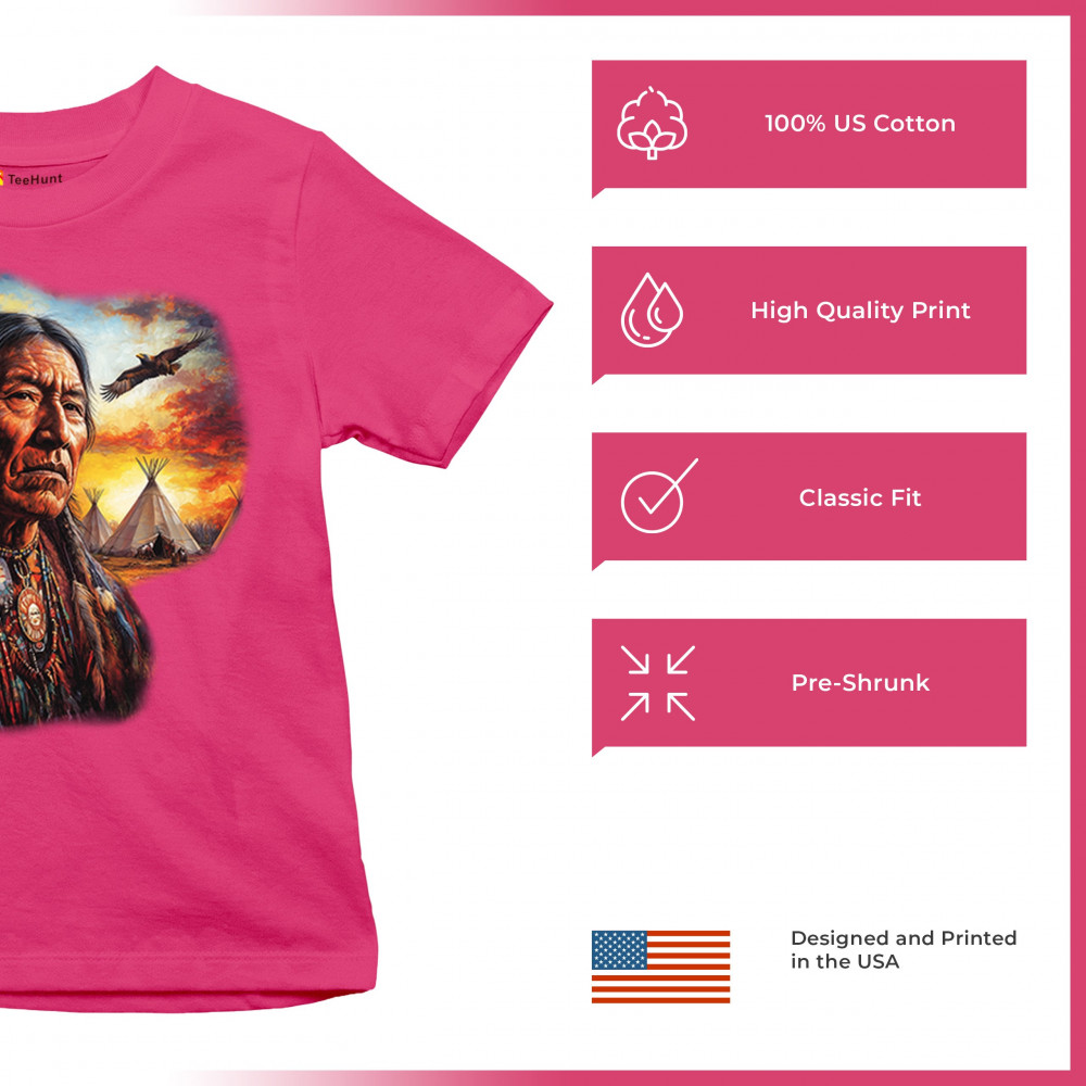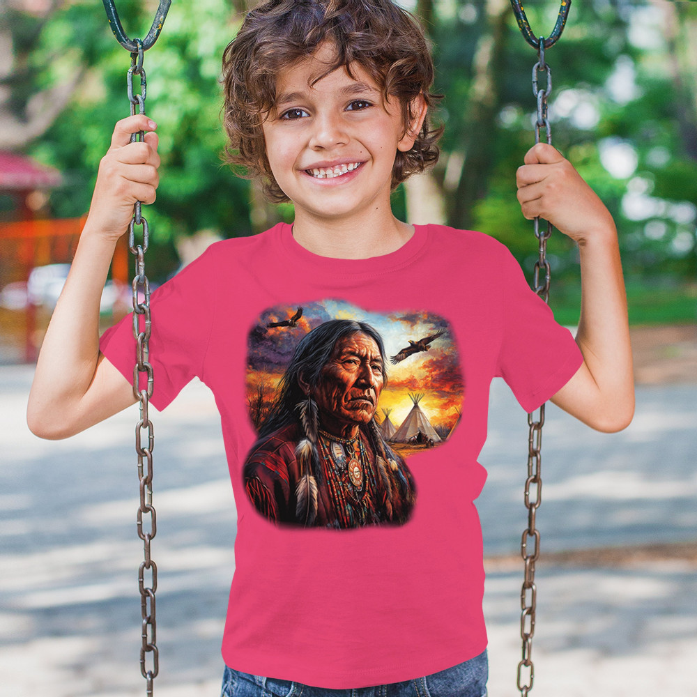 This vivid artwork features a Native American elder in traditional feathered attire, set before a blazing sunset with soaring eagles and peaceful teepees. The scene symbolizes strength, heritage, and spiritual wisdom. A heartfelt tribute to tribal pride, ancestral legacy, and cultural connection to land.