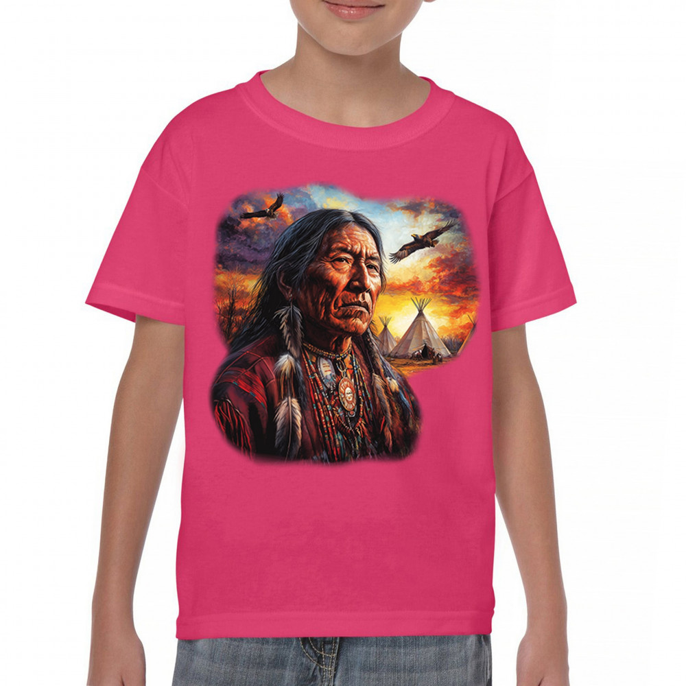 Native elder, teepees, sunset, and eagles come together in this spiritual design celebrating indigenous culture, heritage, and nature’s beauty.