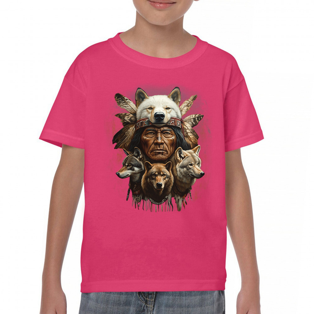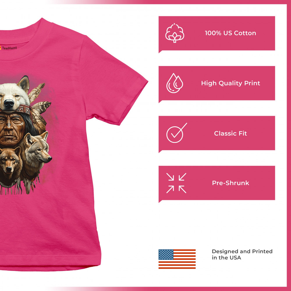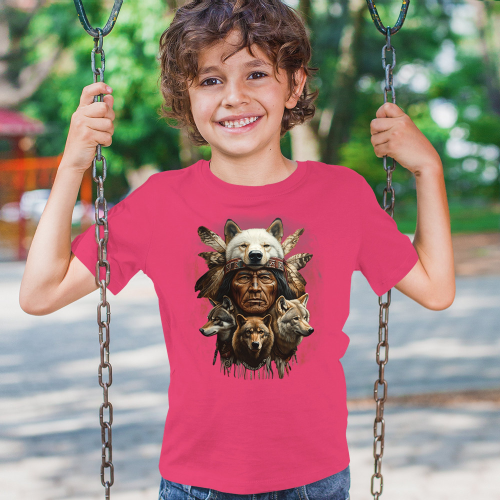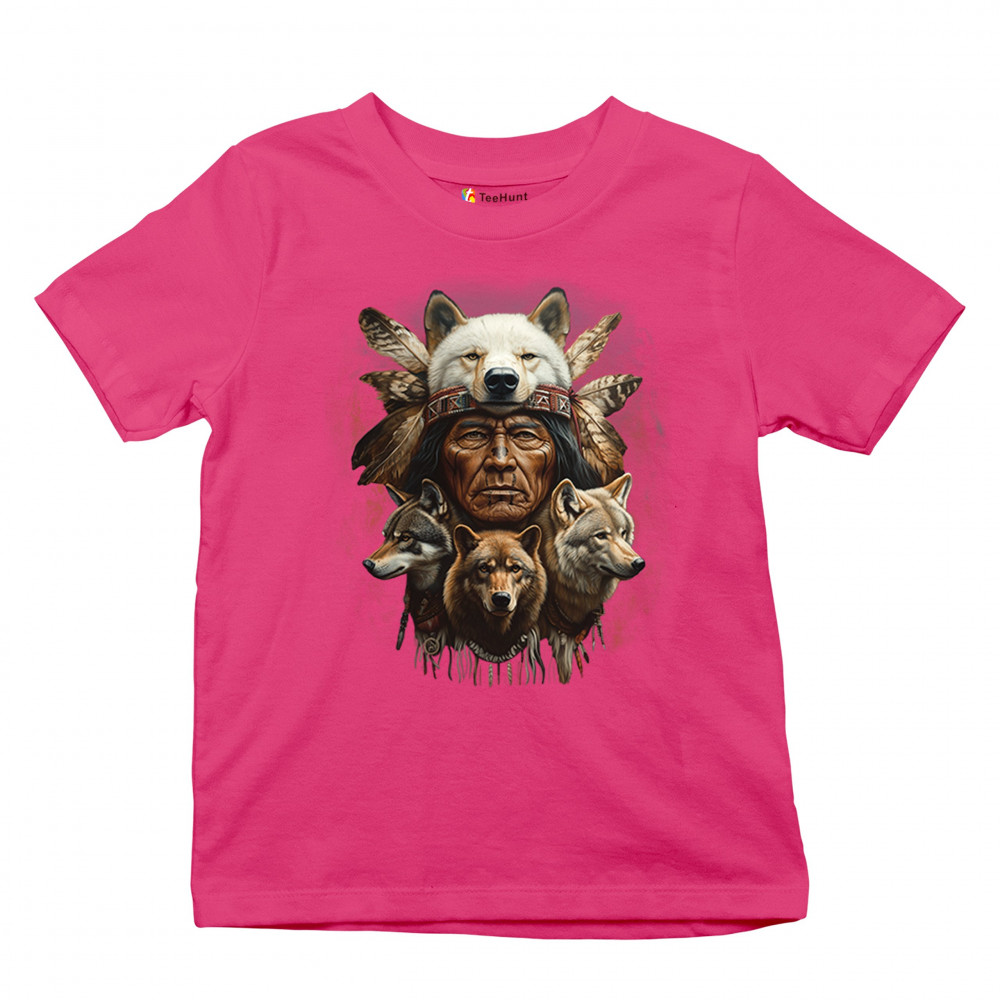 Wolf totem design with Native elder in headdress and guardian wolves. Symbolizes strength, loyalty, spirit animals, and tribal heritage.