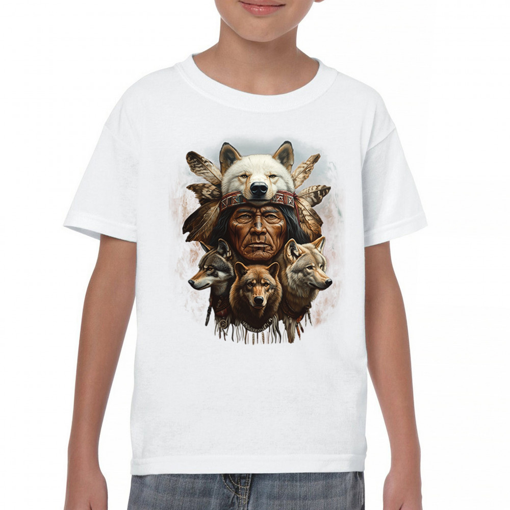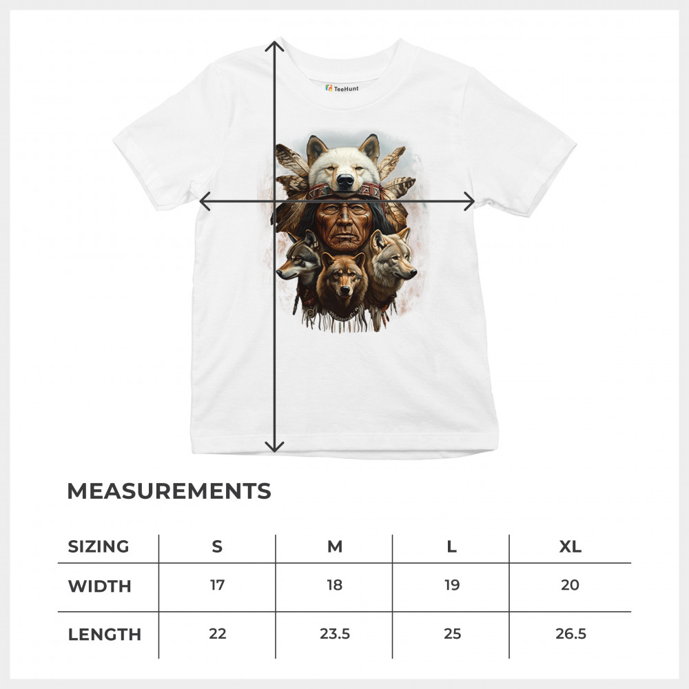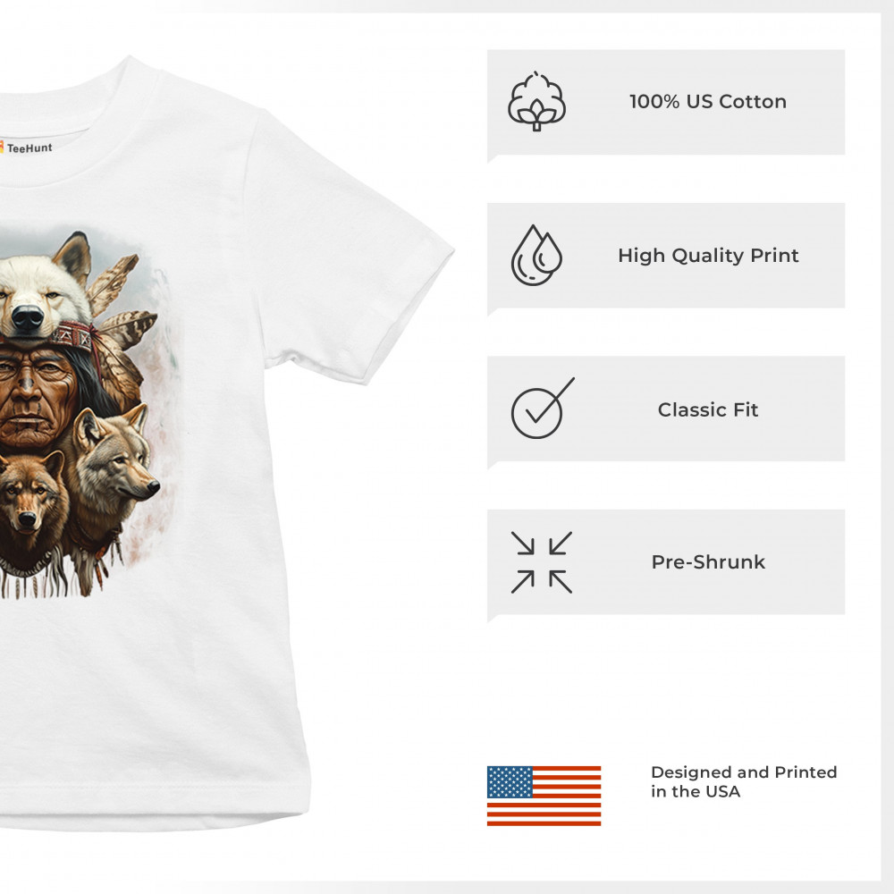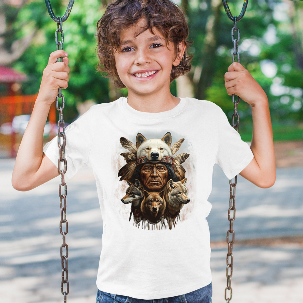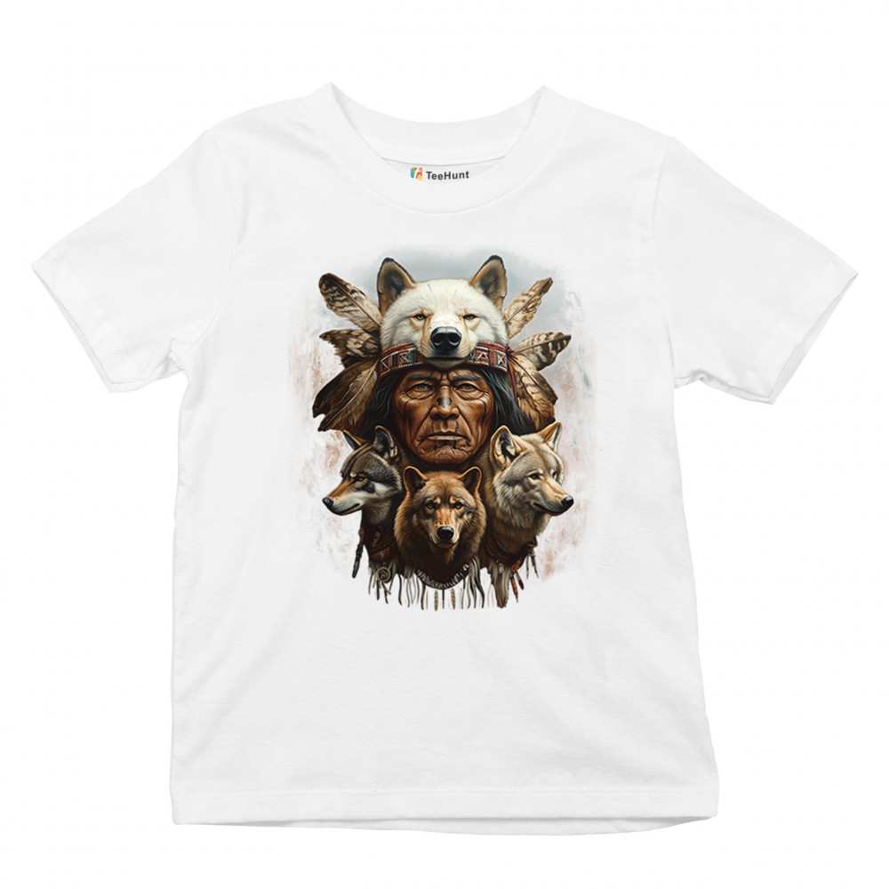 Wolf totem design with Native elder in headdress and guardian wolves. Symbolizes strength, loyalty, spirit animals, and tribal heritage.