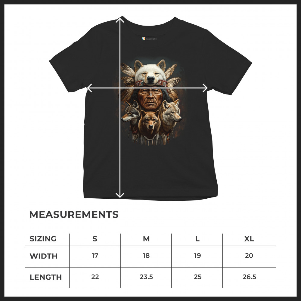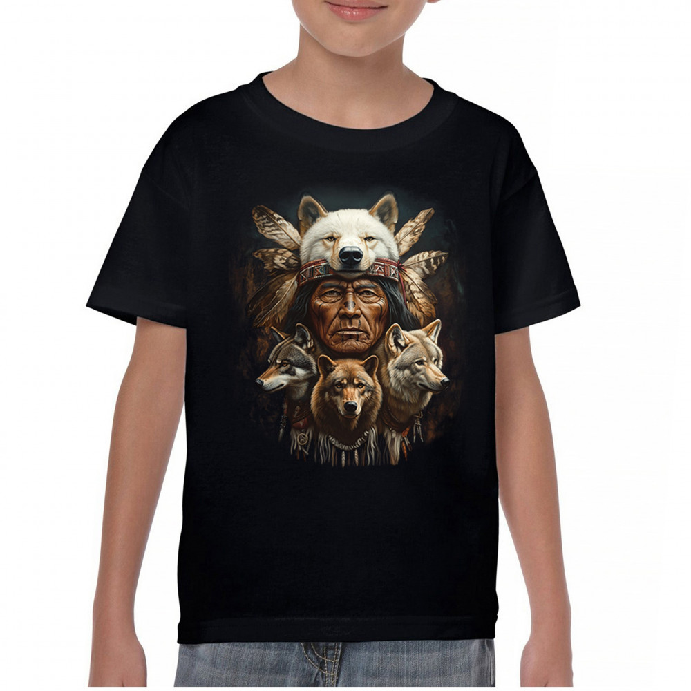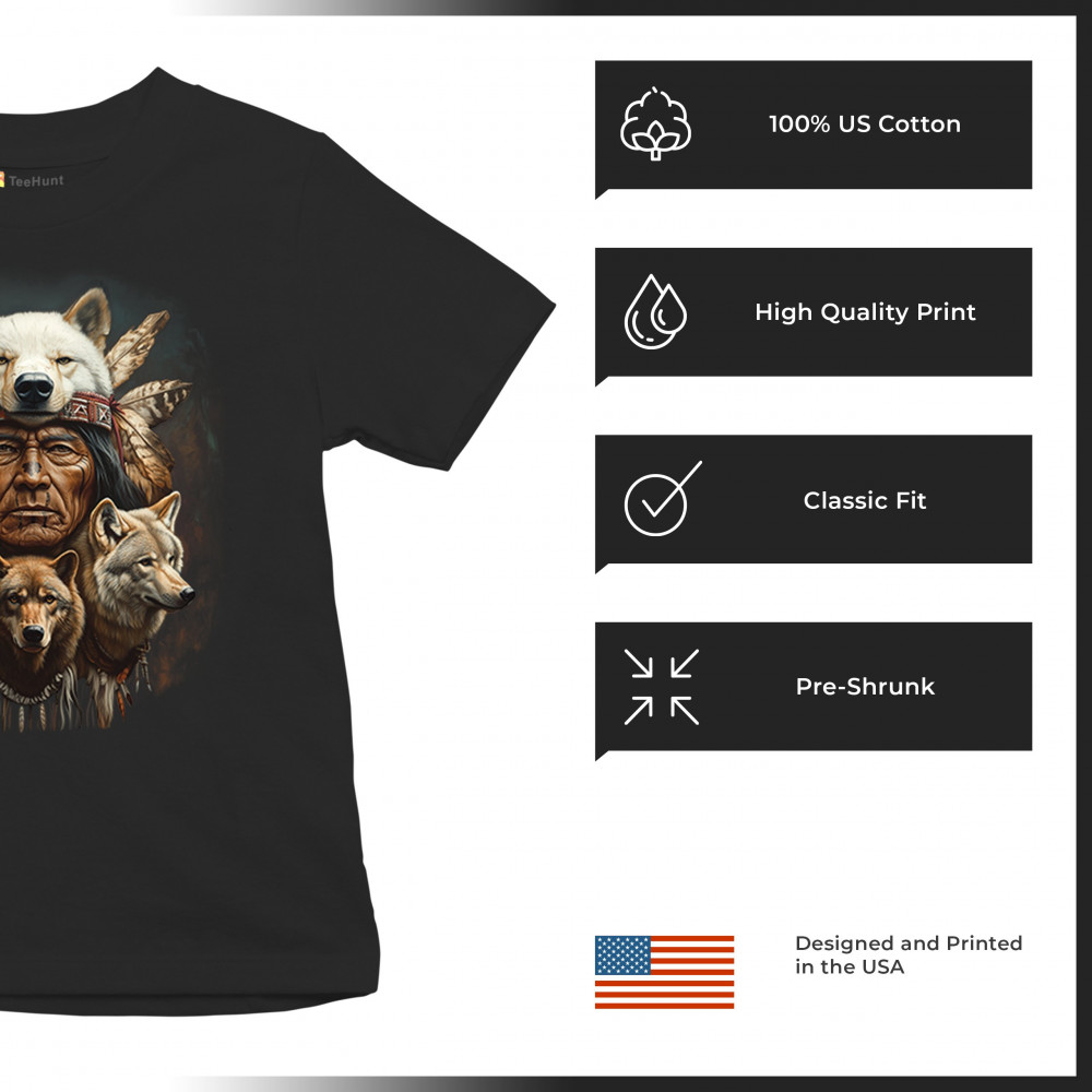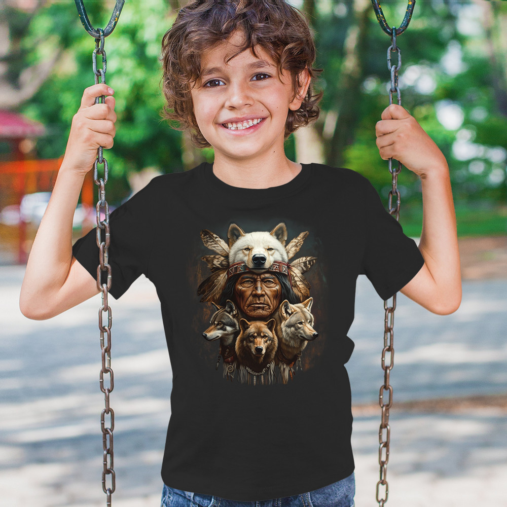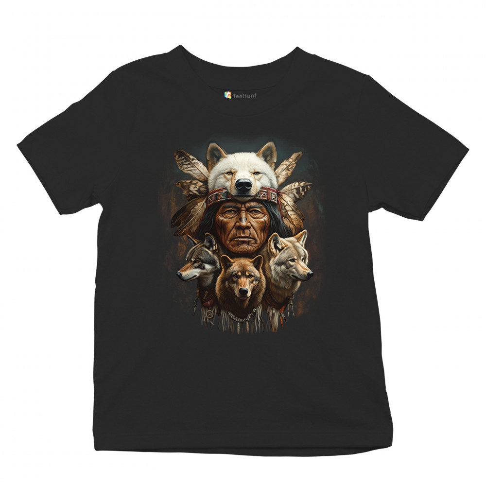 Wolf totem design with Native elder in headdress and guardian wolves. Symbolizes strength, loyalty, spirit animals, and tribal heritage.