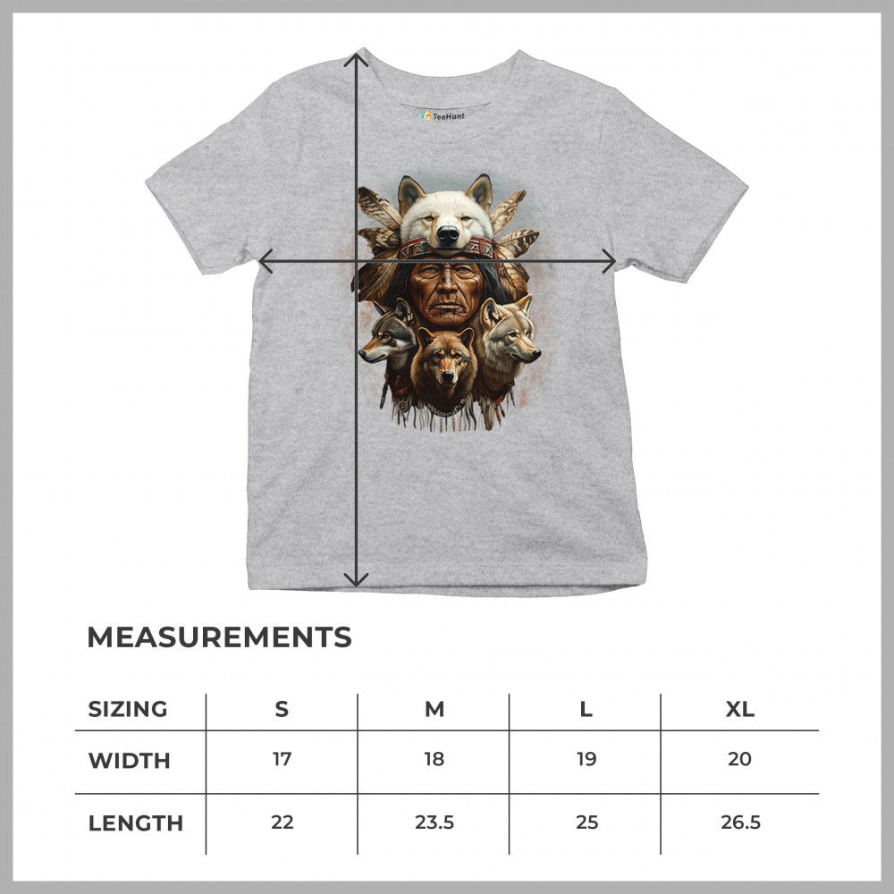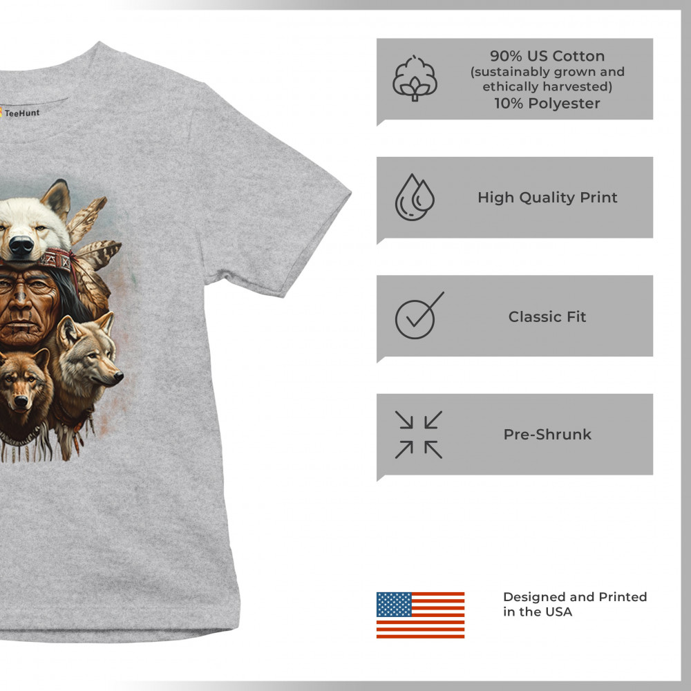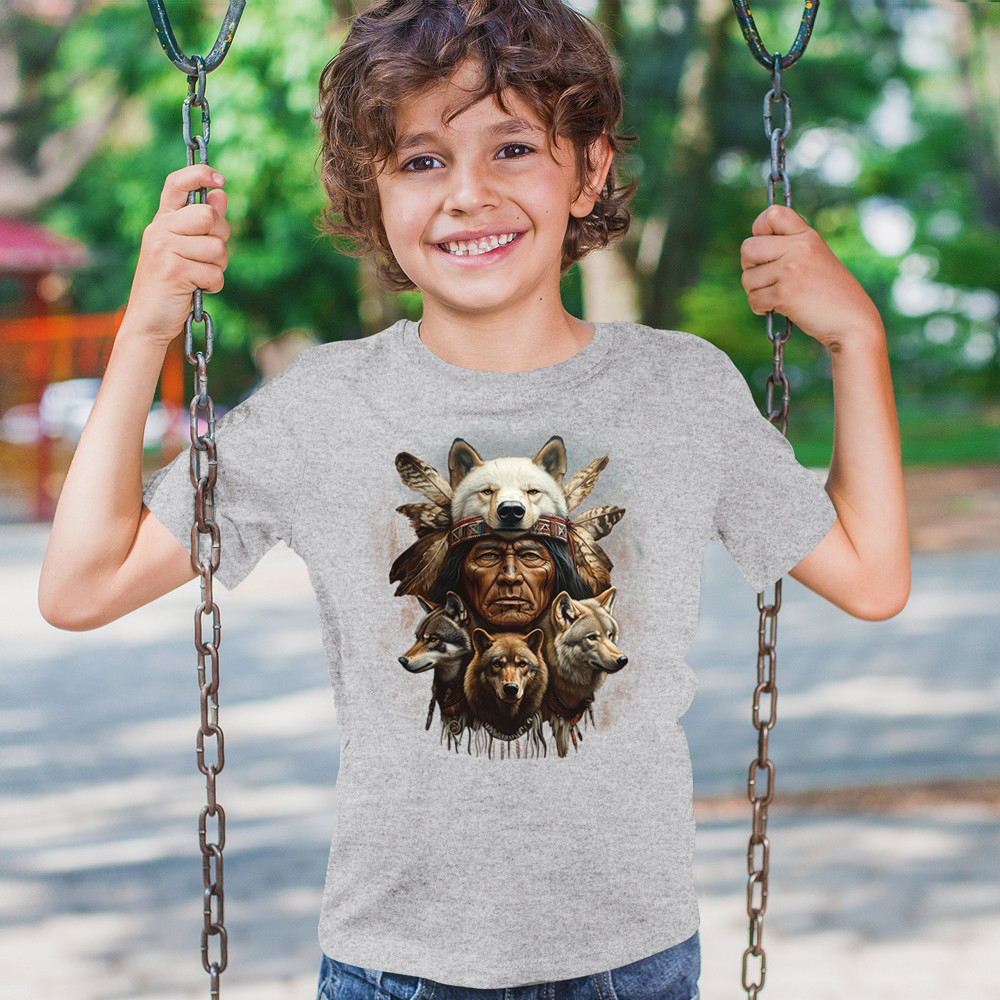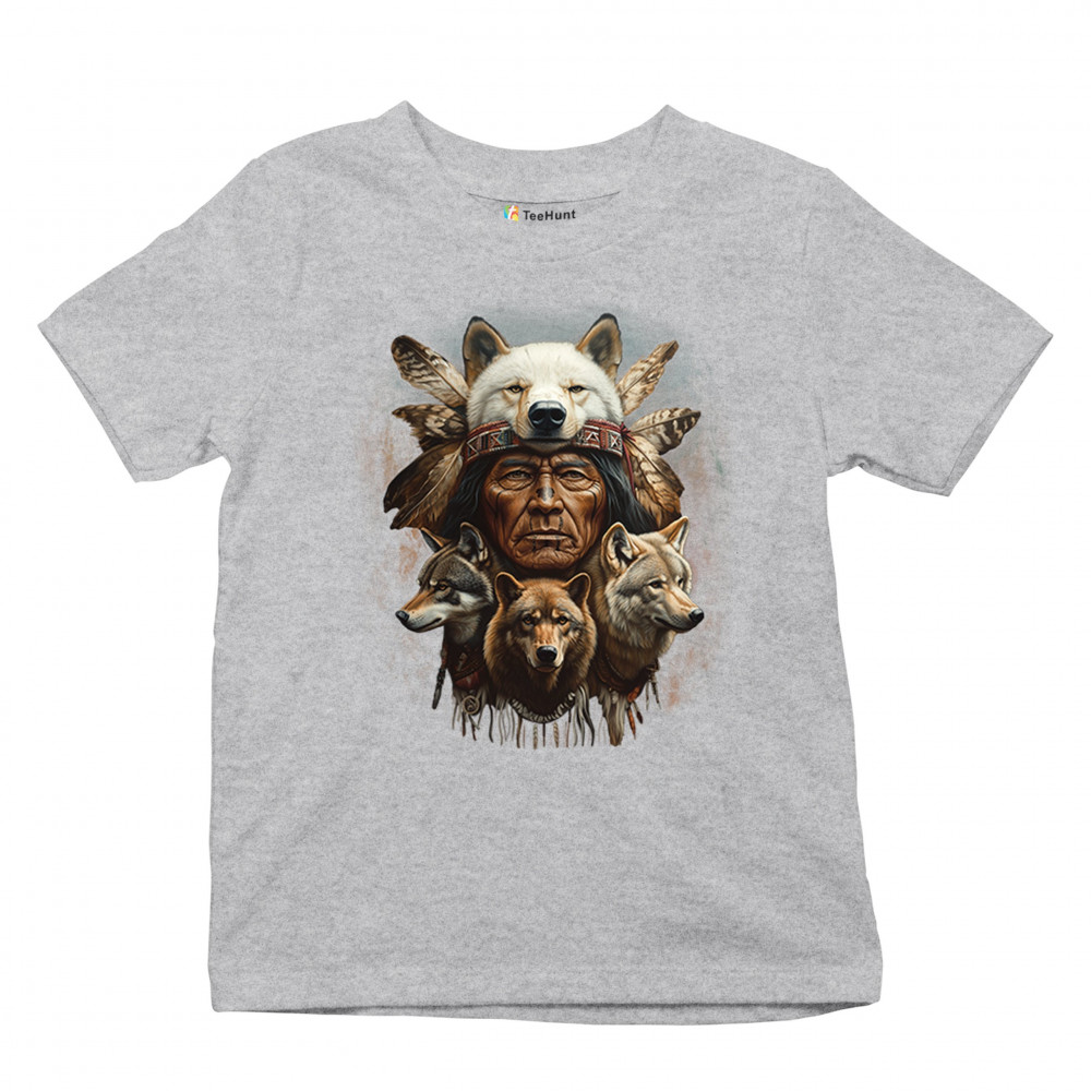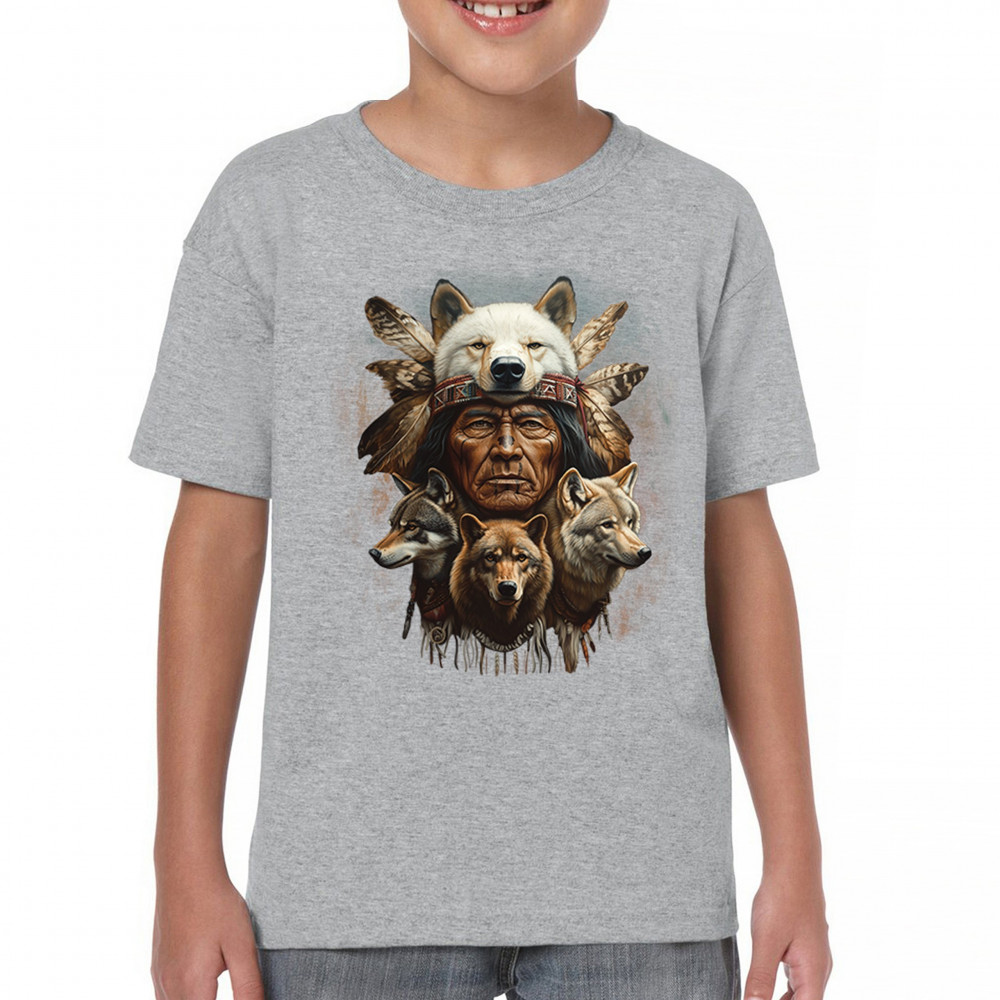 Wolf totem design with Native elder in headdress and guardian wolves. Symbolizes strength, loyalty, spirit animals, and tribal heritage.