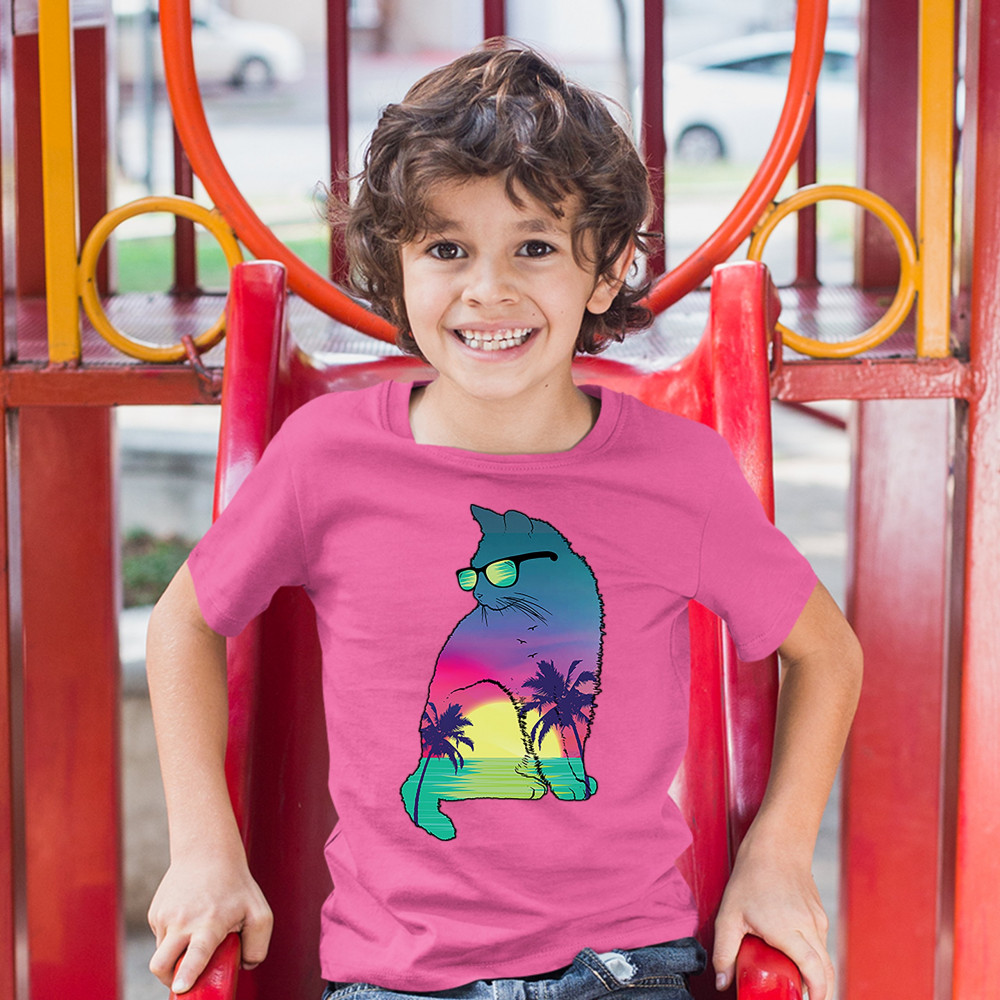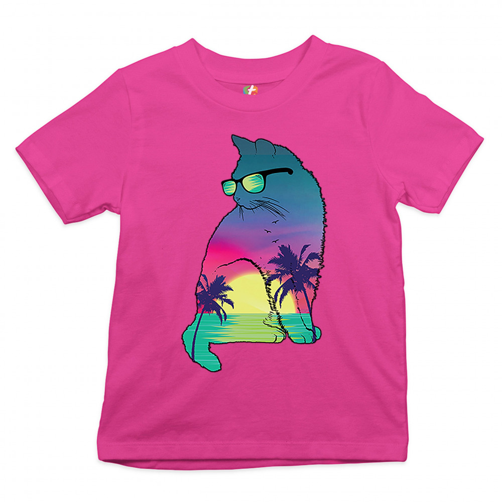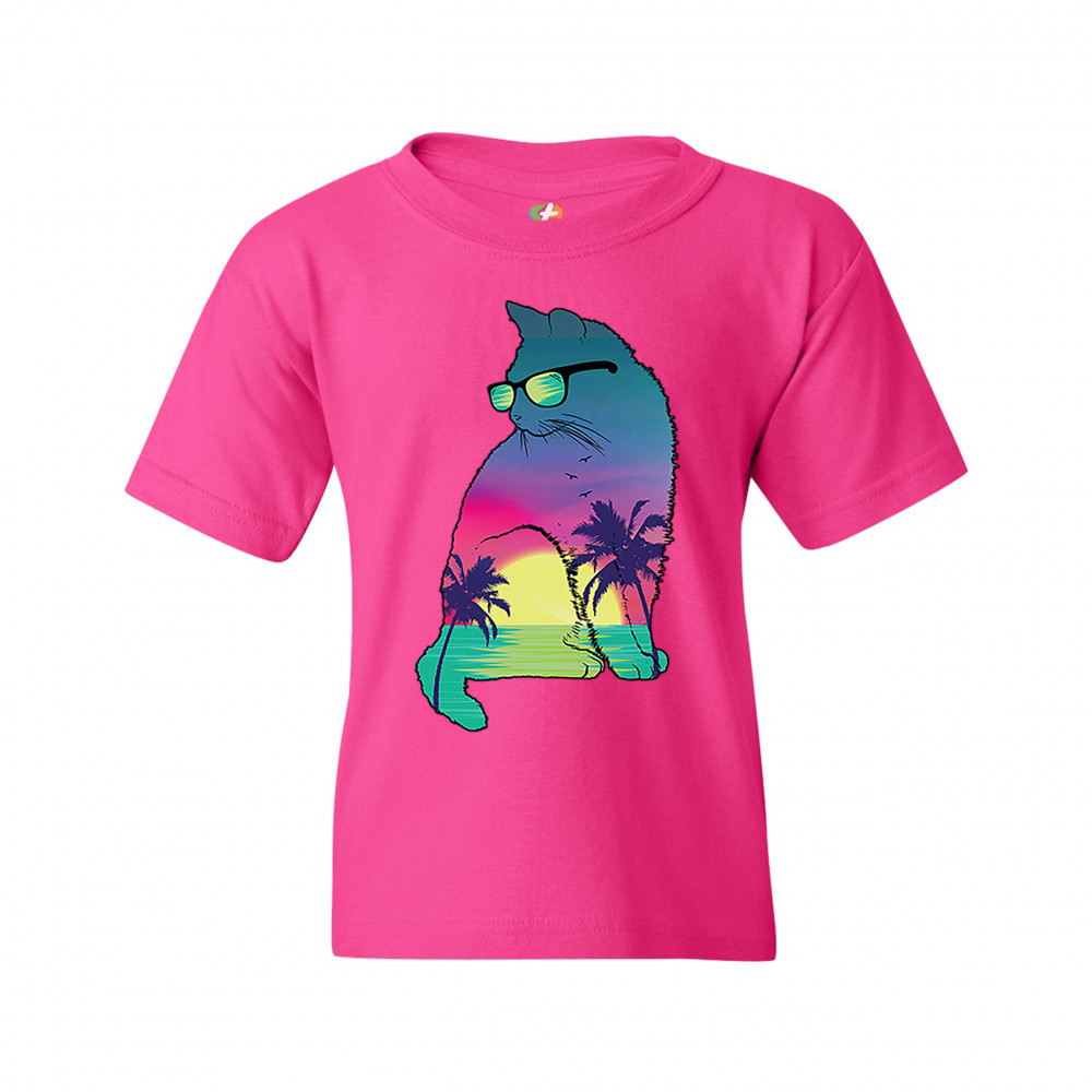 NEON CAT IN SUNGLASSES youth t-shirt tropic kitten summer beach kitty kids pink