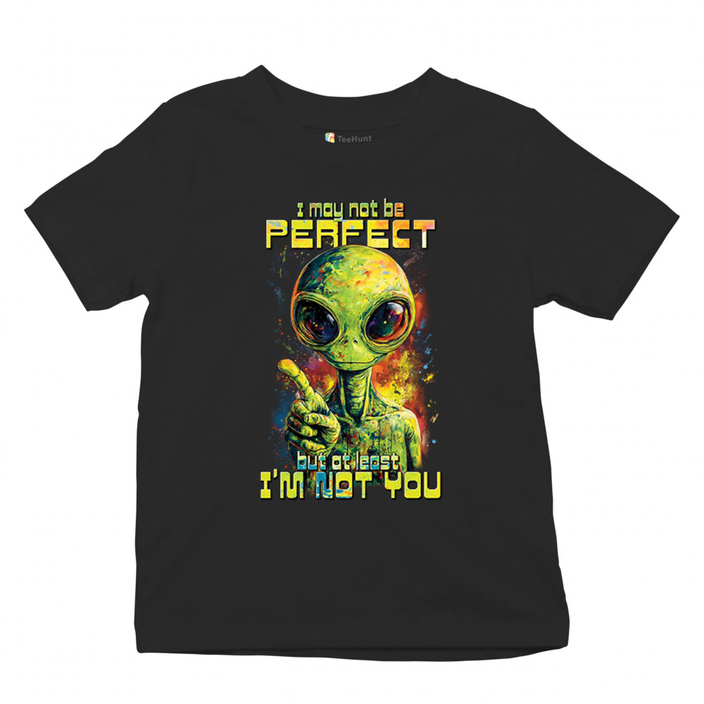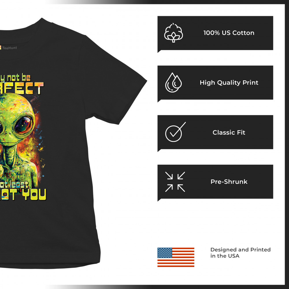 This smug alien design delivers sharp sarcastic humor with vibrant cosmic flair. Featuring a big-eyed extraterrestrial and the quote “I may not be perfect, but at least I’m not you,†it’s perfect for sci-fi fans, alien lovers, jokesters, and oddballs alike. A bold, funny statement for parties, UFO events, and festivals.