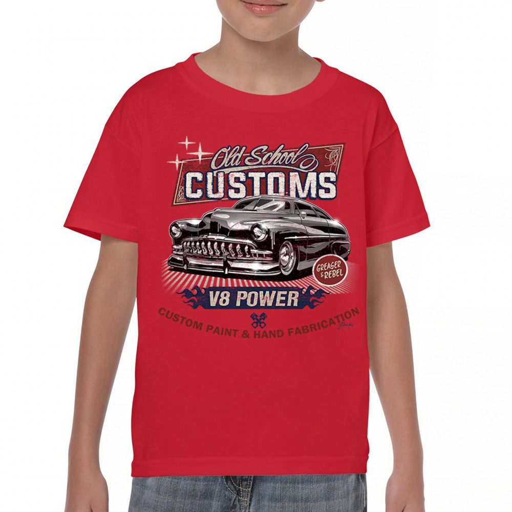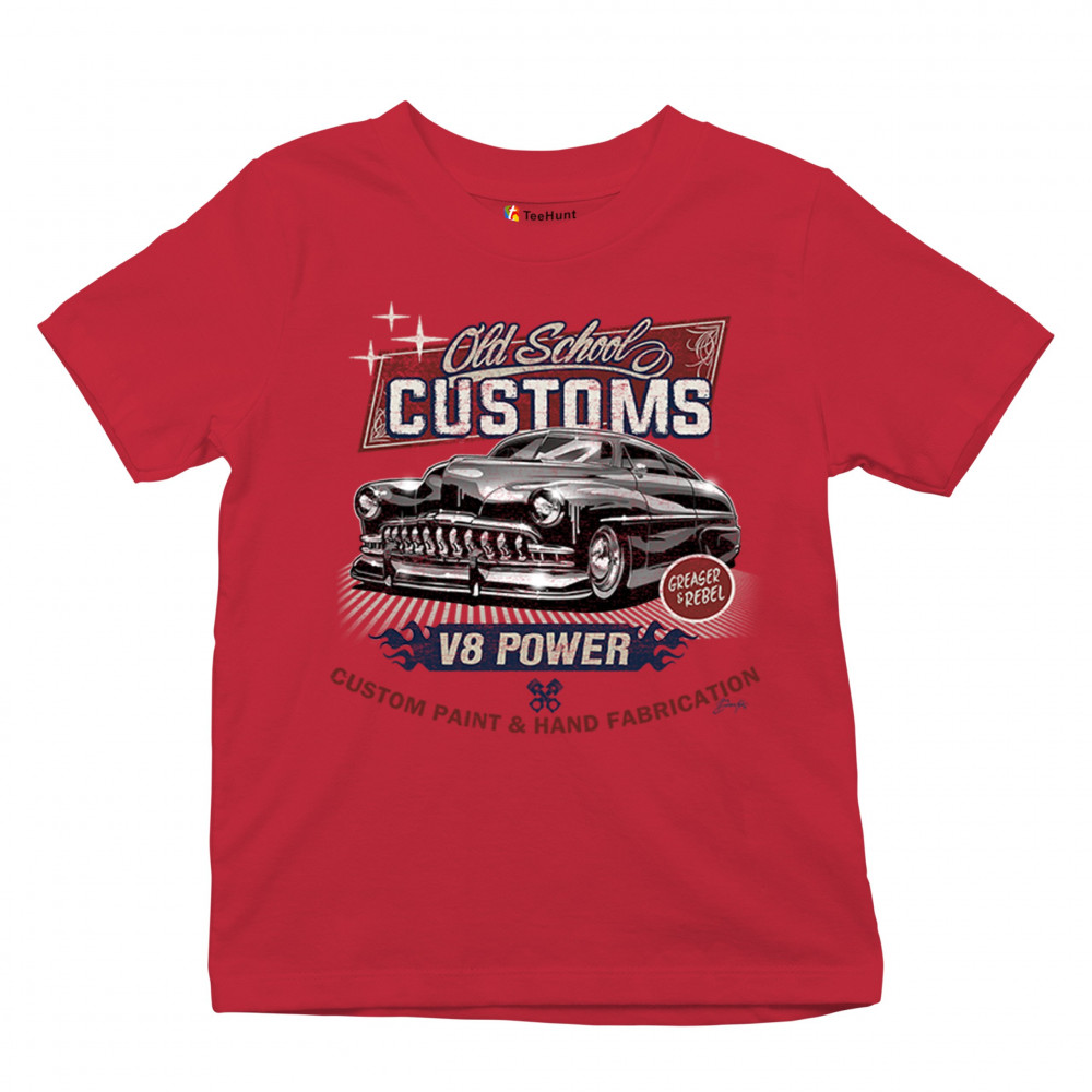 Celebrate classic automotive culture with our "Old School Customs" t-shirt, featuring a V8 power design. Perfect for car enthusiasts and fans of vintage rides.