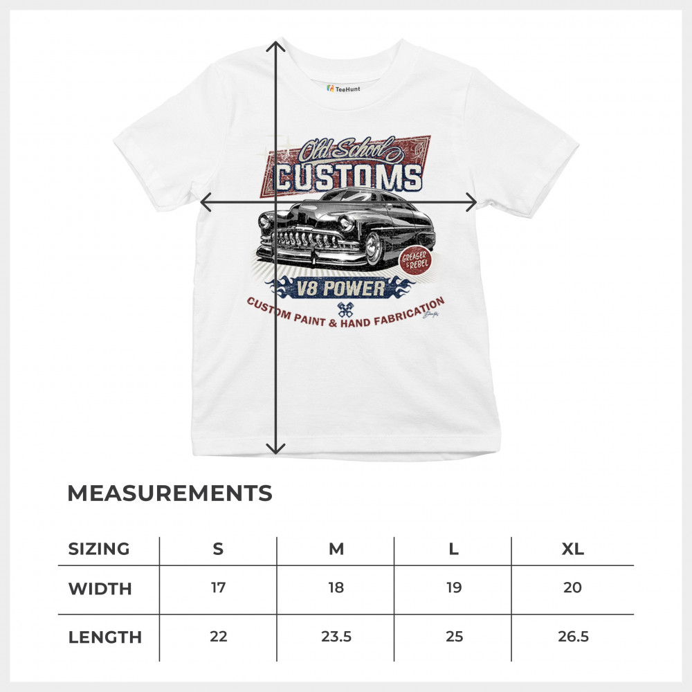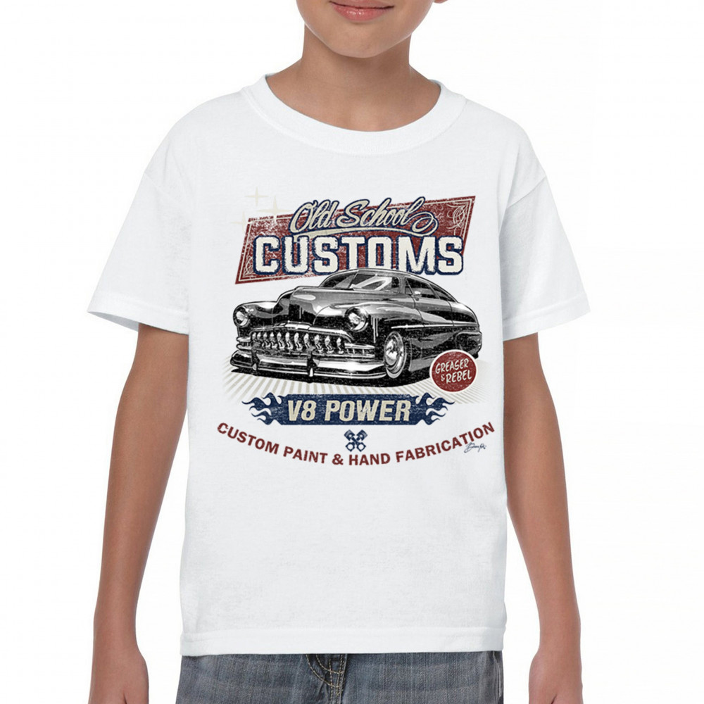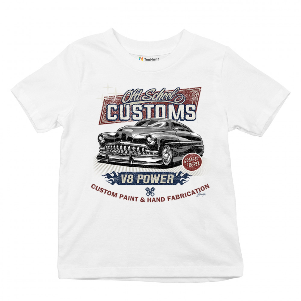 Celebrate classic automotive culture with our "Old School Customs" t-shirt, featuring a V8 power design. Perfect for car enthusiasts and fans of vintage rides.