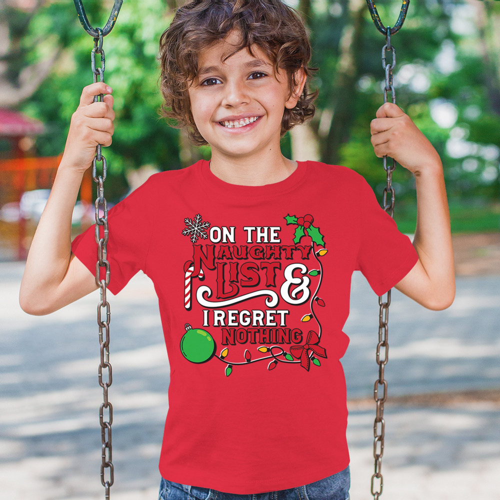 Express your holiday spirit with humor through the "Naughty List & I Regret Nothing" design, a perfect companion for Christmas celebrations, gift exchanges, or festive family gatherings. It adds a touch of playfulness to your winter wardrobe while spreading joy and laughter. Ideal for pairing with an ugly sweater or cozy holiday apparel, it’s the ultimate way to stay jolly and carefree throughout the season.