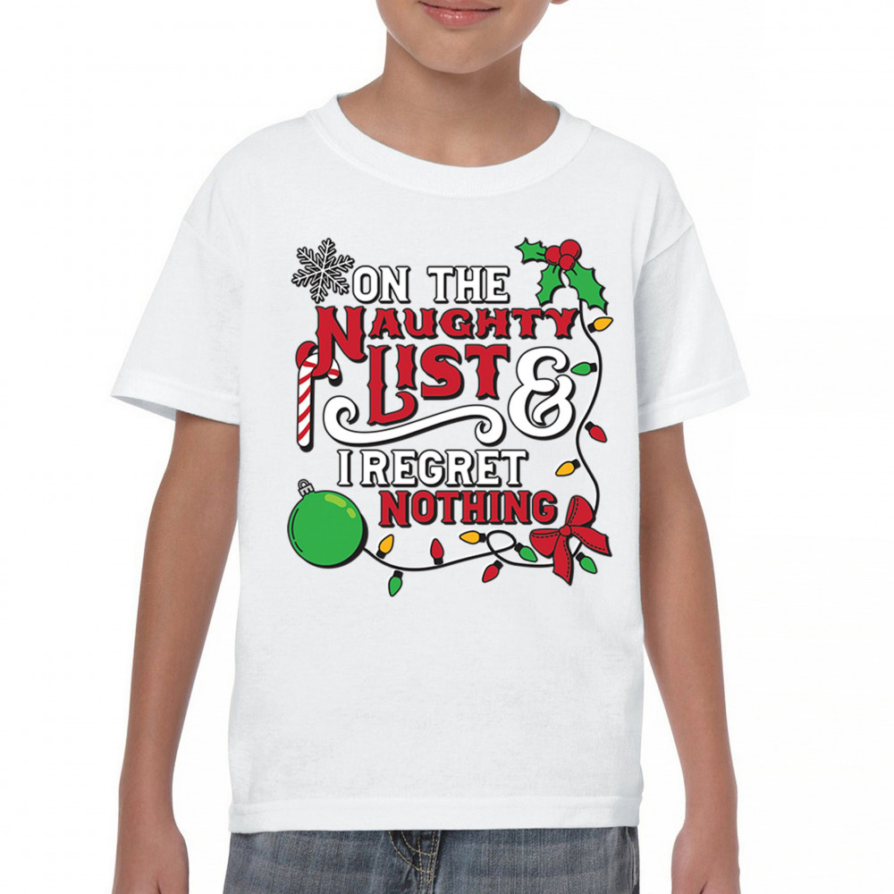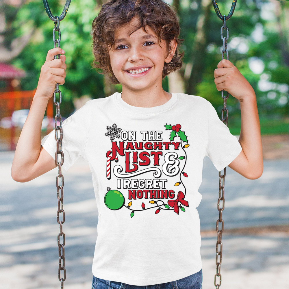 Express your holiday spirit with humor through the "Naughty List & I Regret Nothing" design, a perfect companion for Christmas celebrations, gift exchanges, or festive family gatherings. It adds a touch of playfulness to your winter wardrobe while spreading joy and laughter. Ideal for pairing with an ugly sweater or cozy holiday apparel, it’s the ultimate way to stay jolly and carefree throughout the season.
