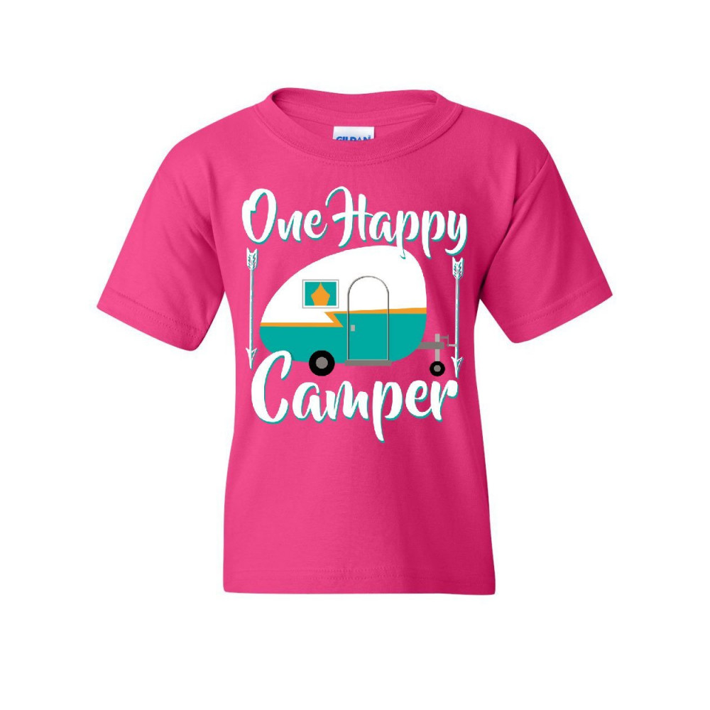 ONE HAPPY CAMPER youth t-shirt camping roadtrip rv trailer kids tee pink