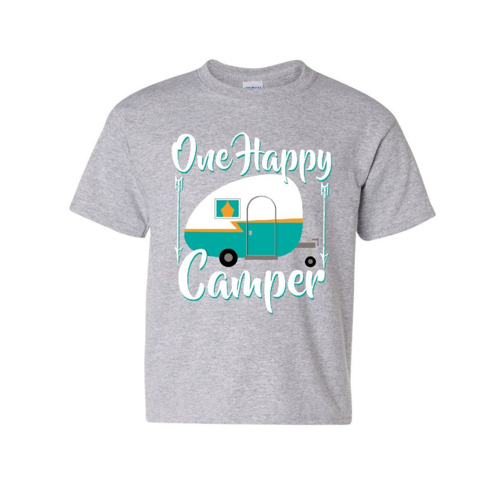 ONE HAPPY CAMPER youth t-shirt camping roadtrip rv trailer kids tee gray
