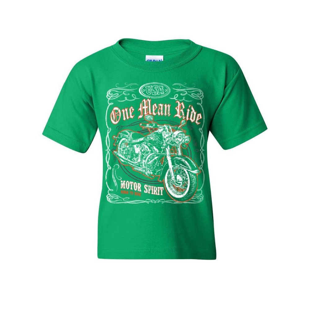 ONE MEAN RIDE youth t-shirt born to ride chopper bobber route 66 biker kids tee green