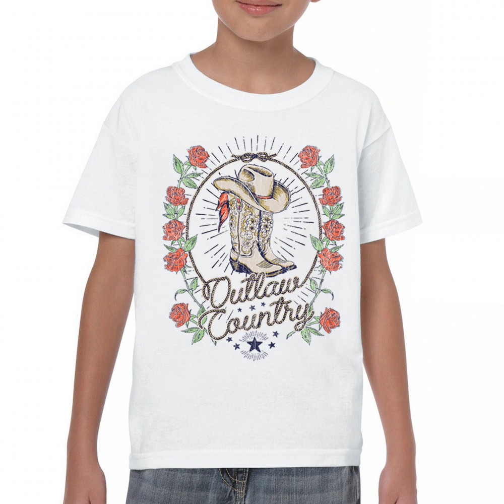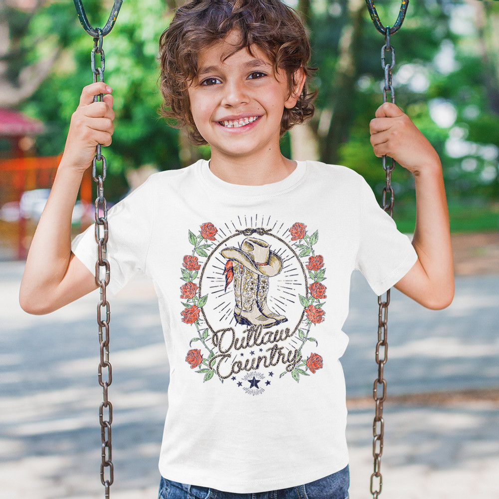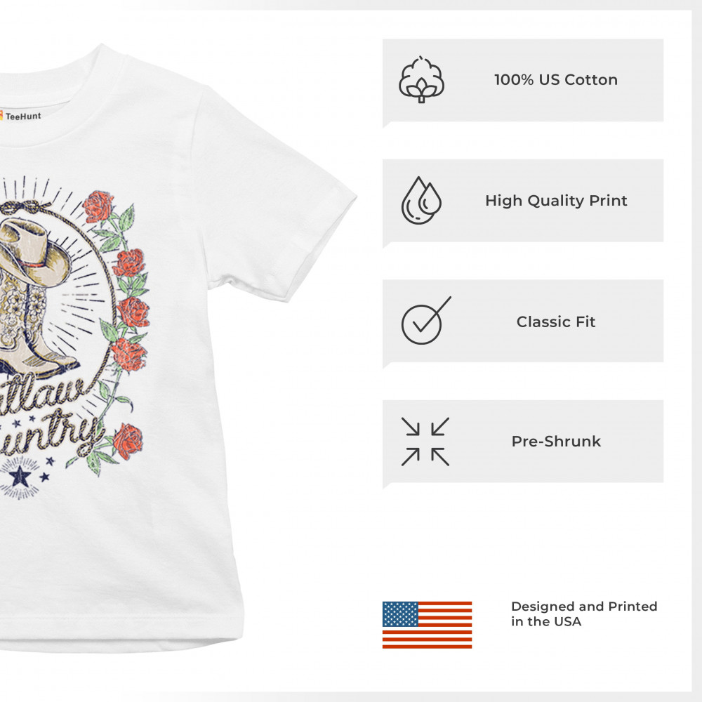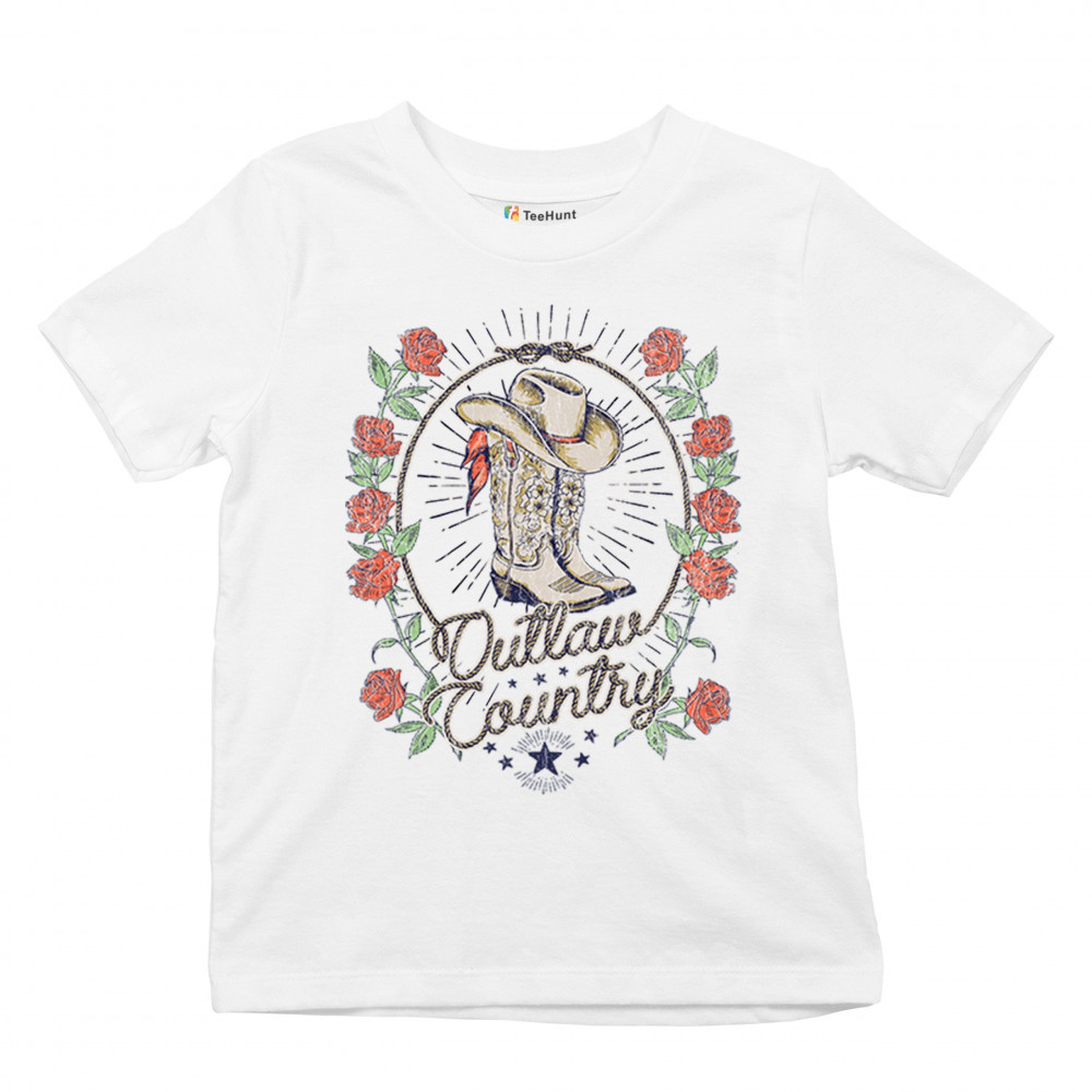 Outlaw country design with cowgirl boots, hat, and roses. Bold feminine western style for concerts, rodeos, and southern lifestyle lovers.