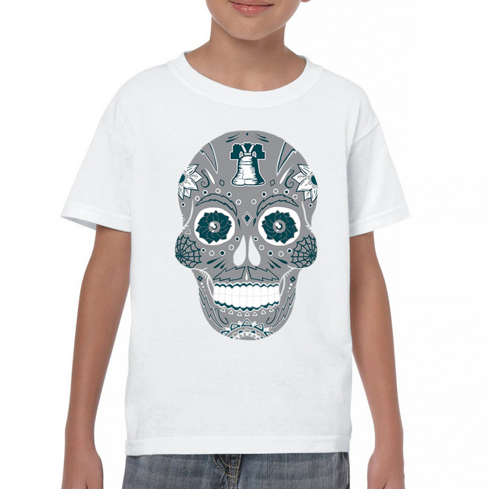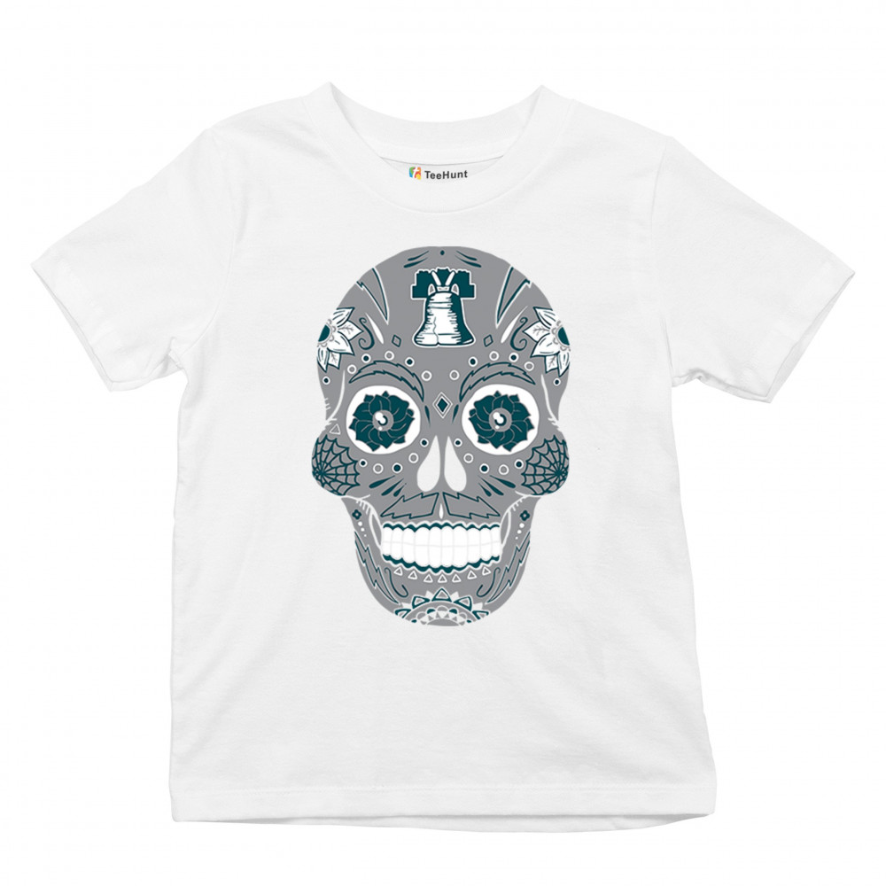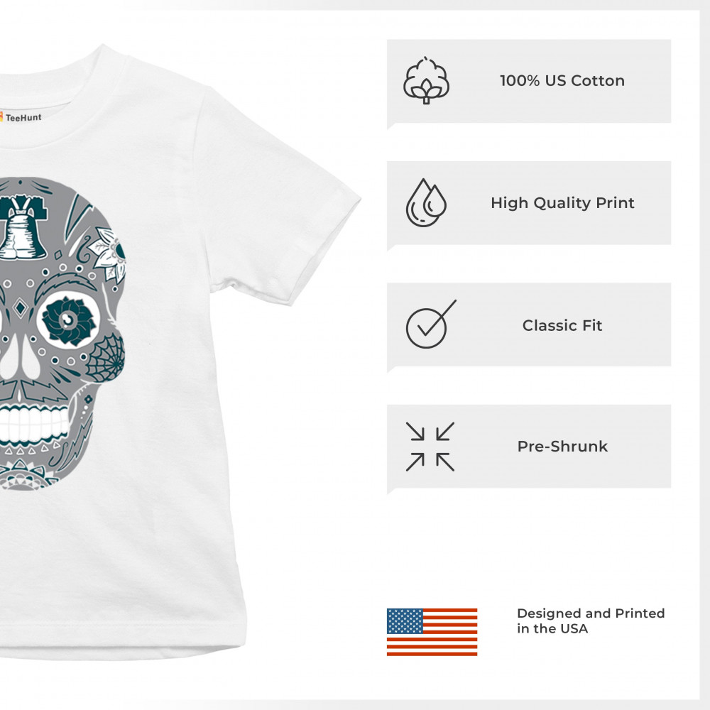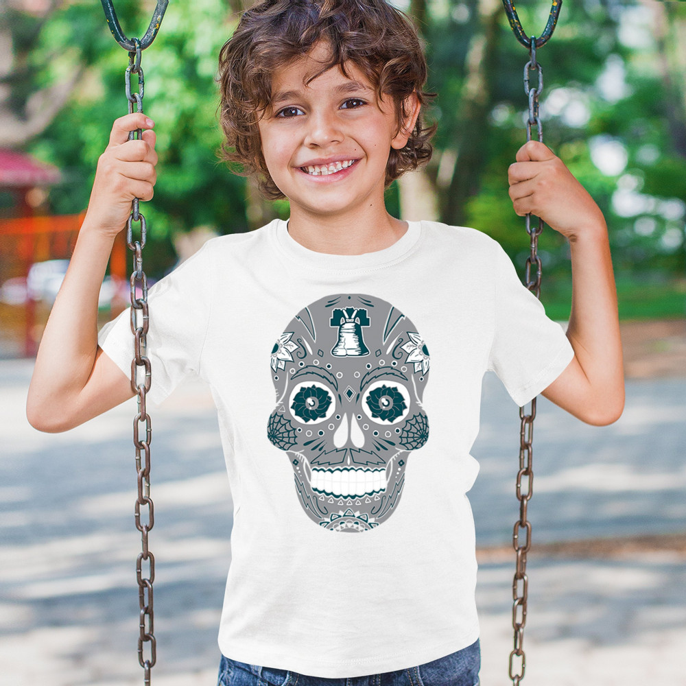 Philly meets tradition in this Sugar Skull design, mixing calavera art with the iconic liberty bell and marigold flowers. Perfect for Philly sports culture, fantasy league energy, or game day skull vibes, it captures Philly gothic art and fan zone spirit. A unique way to honor Dia de los Muertos while showing local Philadelphia pride and heritage in bold style.