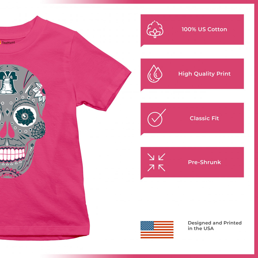 Philly sugar skull with liberty bell art, marigold flower calavera, gothic Philly art, sports culture pride, and game day skull vibes.