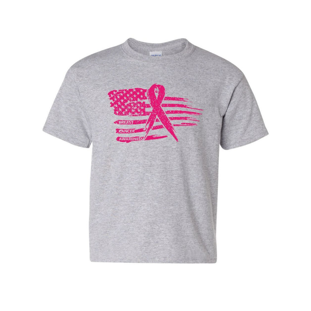 PINK RIBBON AMERICAN FLAG pink ribbon flag youth t-shirt breast cancer awareness hope survivor kids tee gray