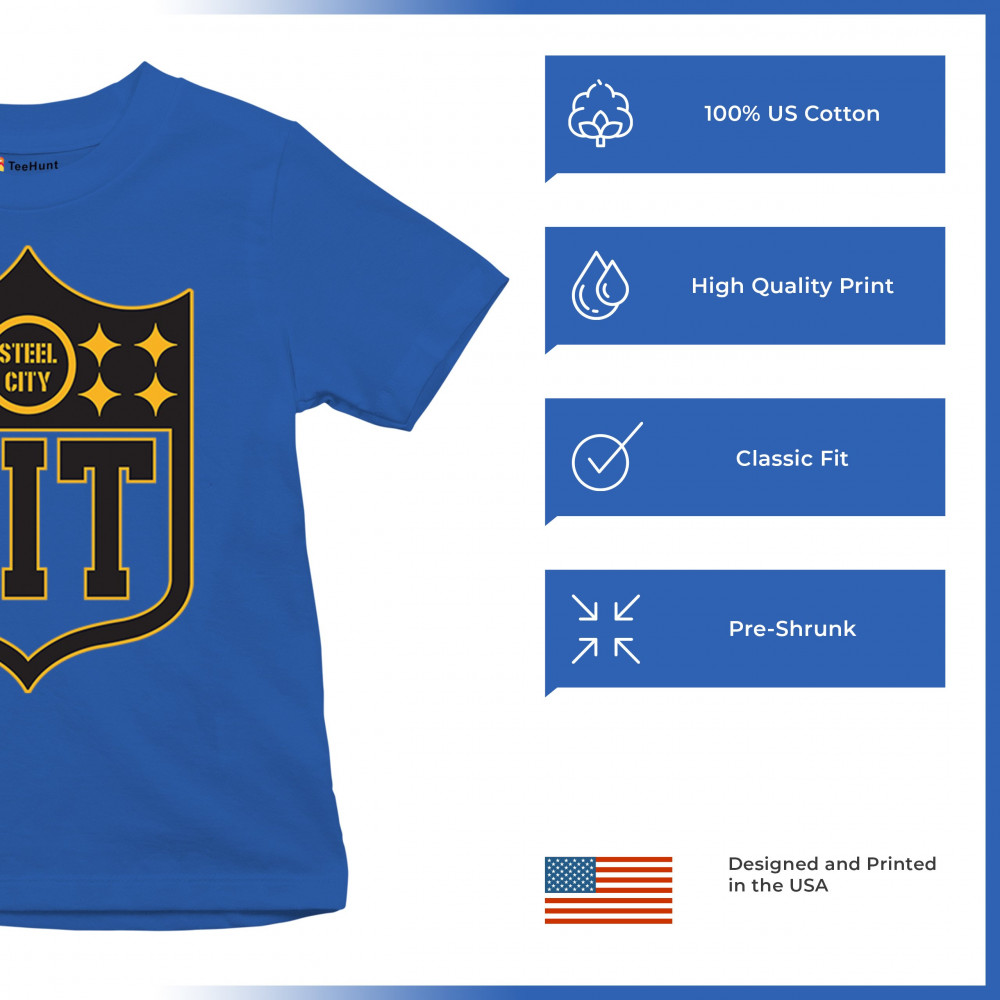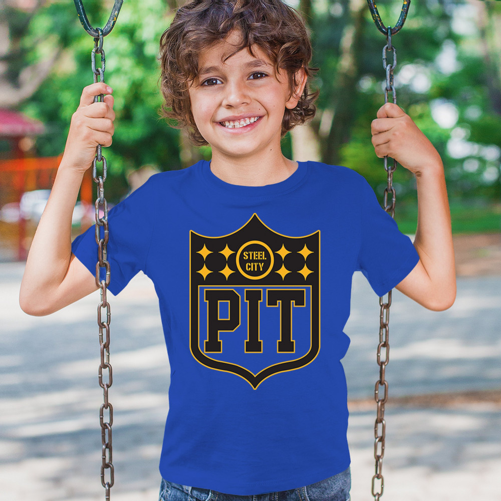 Steel City PIT shield football gear celebrating Pittsburgh football nation, gridiron tradition, playoff vibes, and sports heritage.