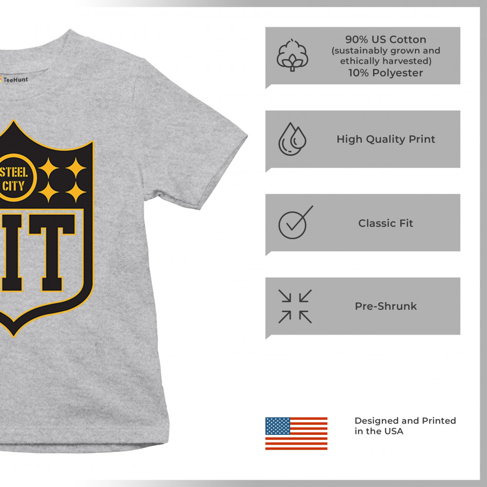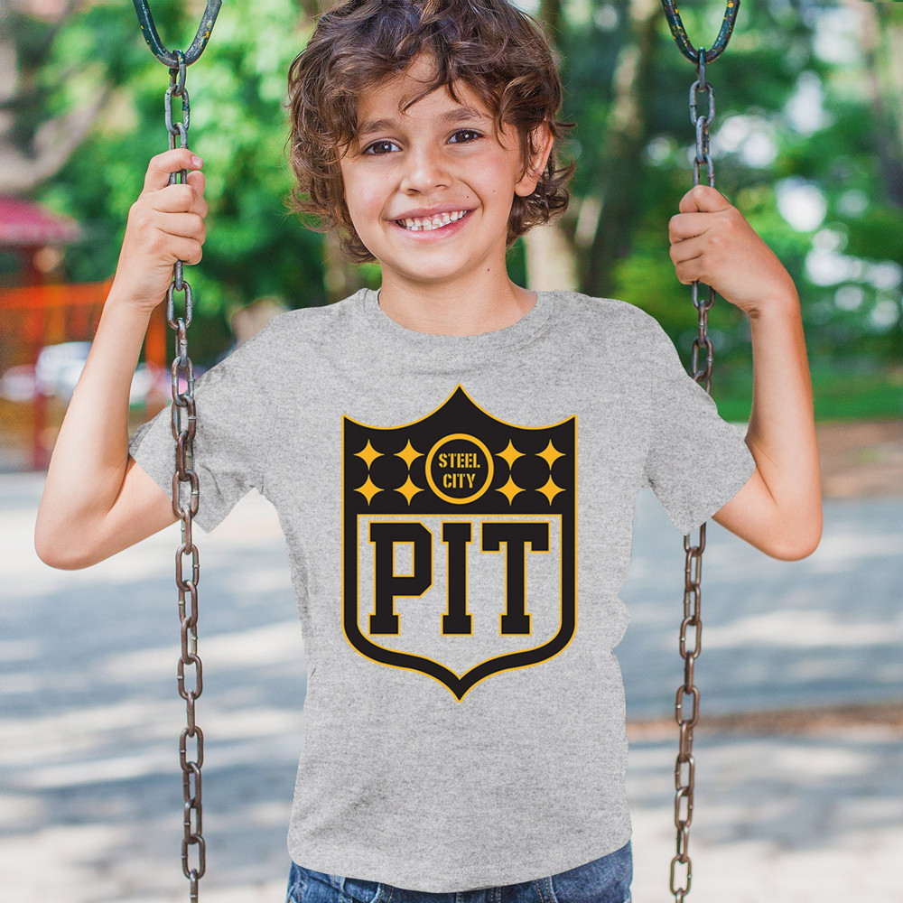 Steel City PIT shield football gear celebrating Pittsburgh football nation, gridiron tradition, playoff vibes, and sports heritage.