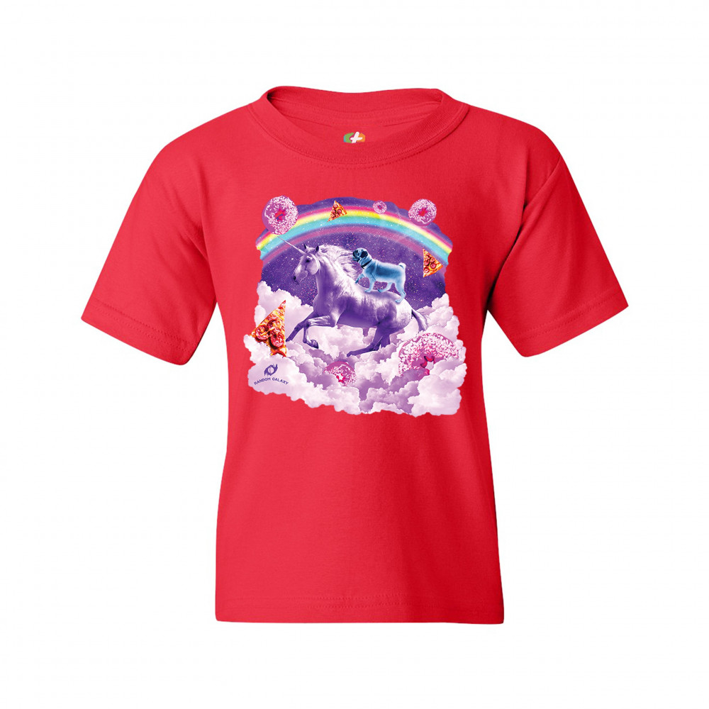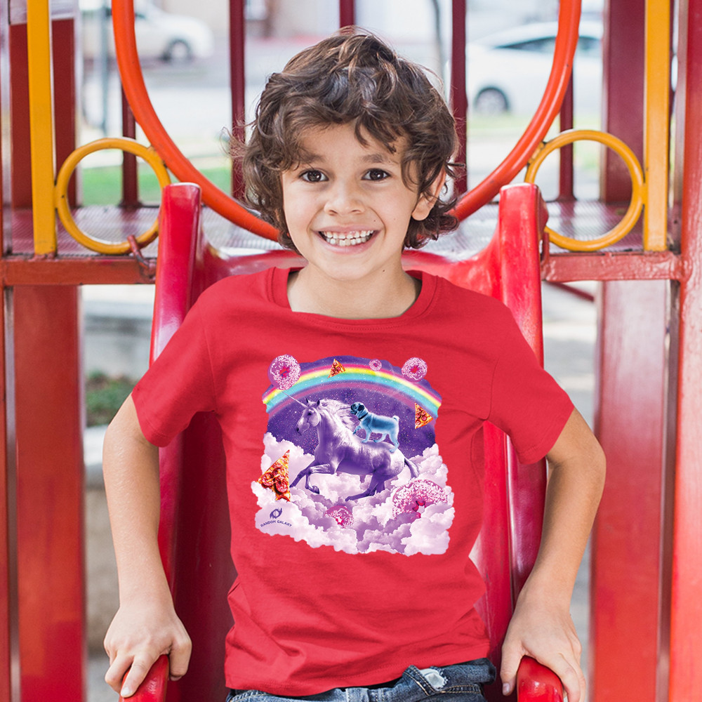 A beautiful print featuring a pug standing on a back of a unicorn galloping through clouds. In the background a rainbow crossing the space is seen. Across the clouds numerous pizza slices and donuts are scattered. A great choice for a person who loves pug