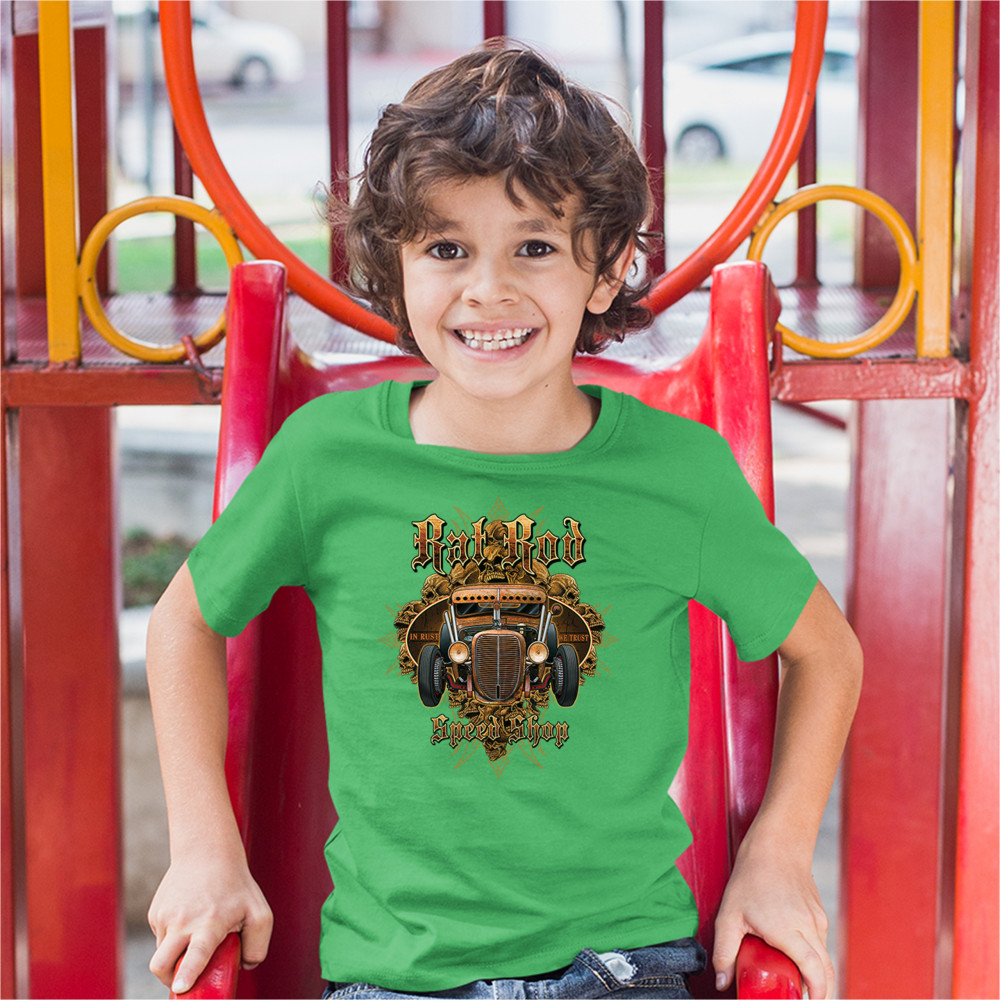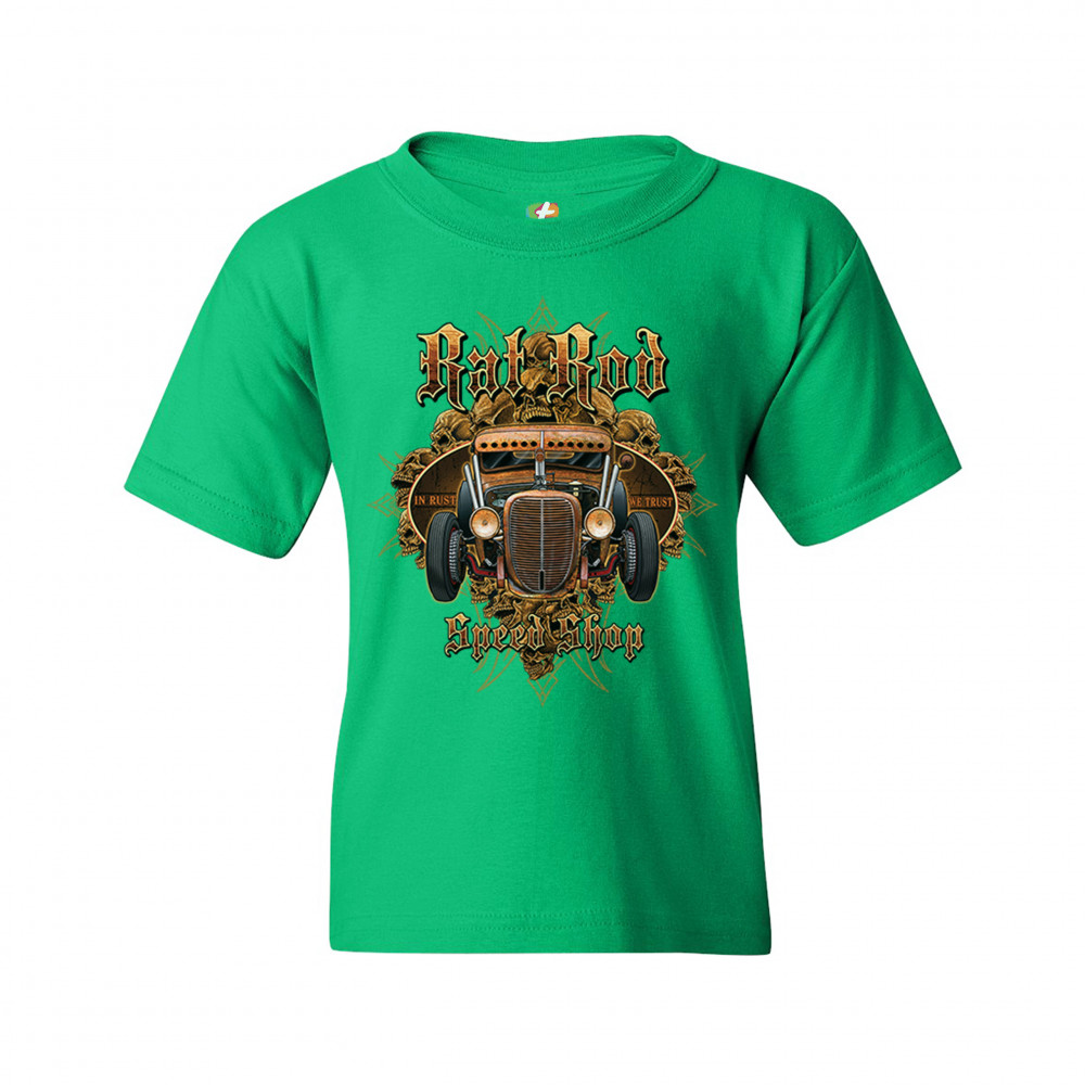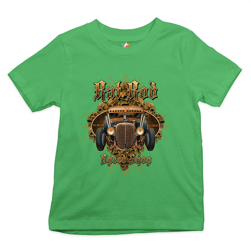 RAT ROD IN RUST WE TRUST youth t-shirt hot rod route 66 old school kids green