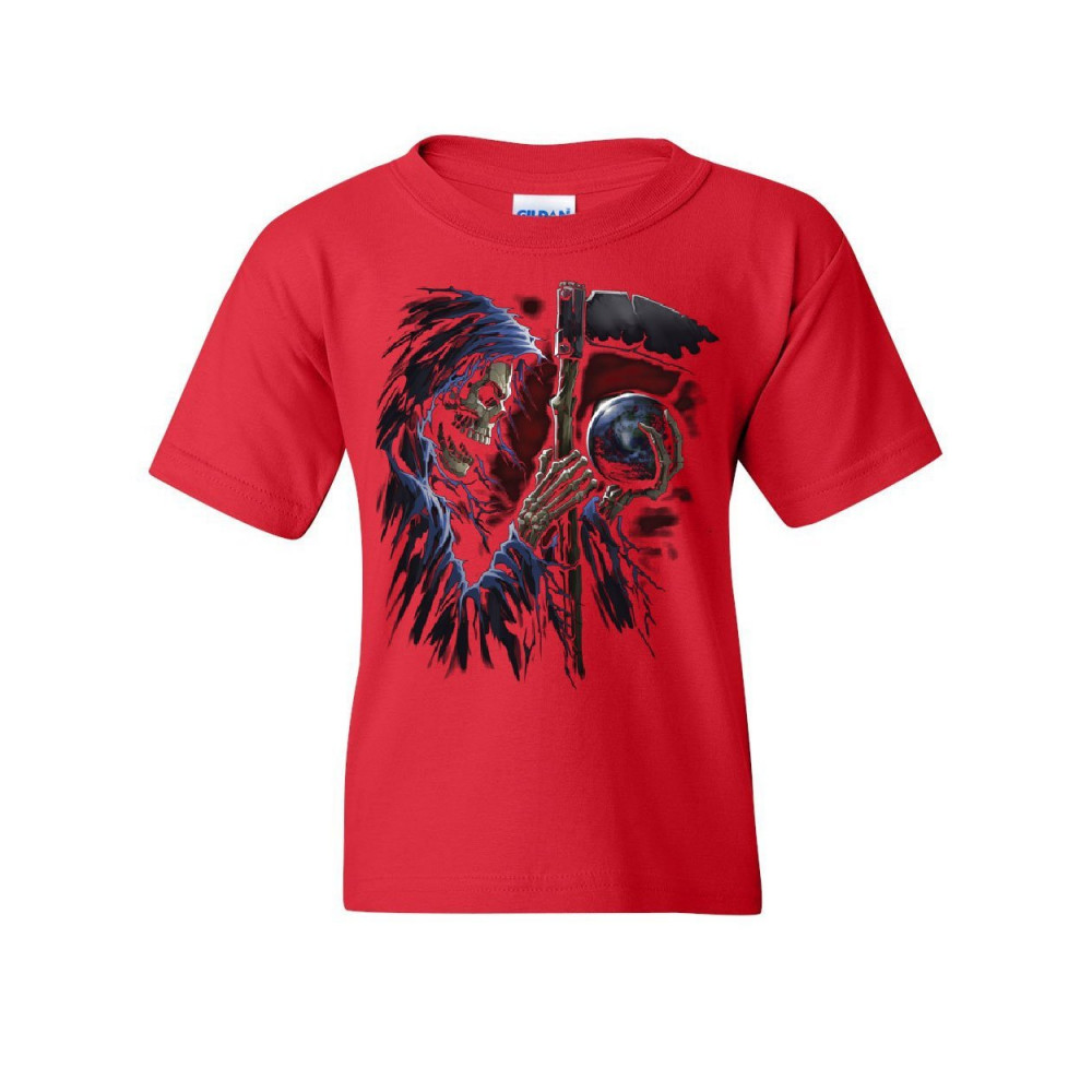 REAPER SPHERE SCYTHE youth t-shirt death skull creepy scary monster kids tee red