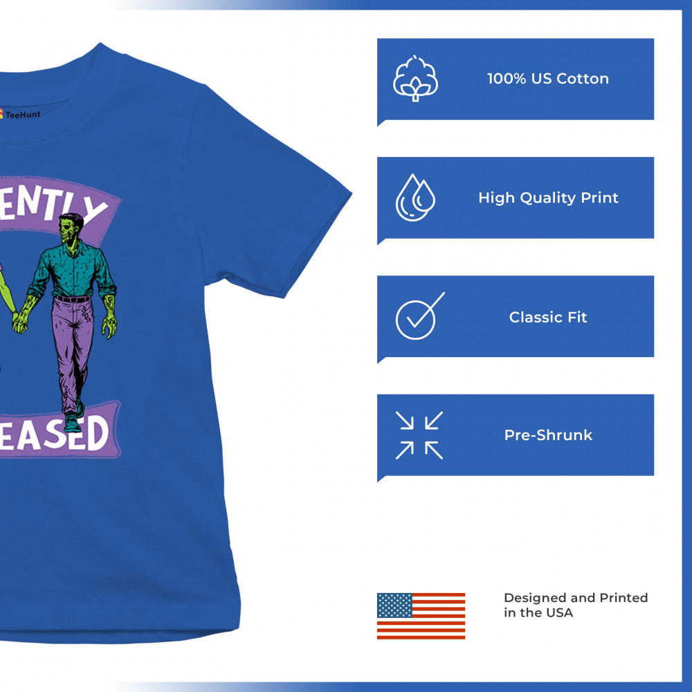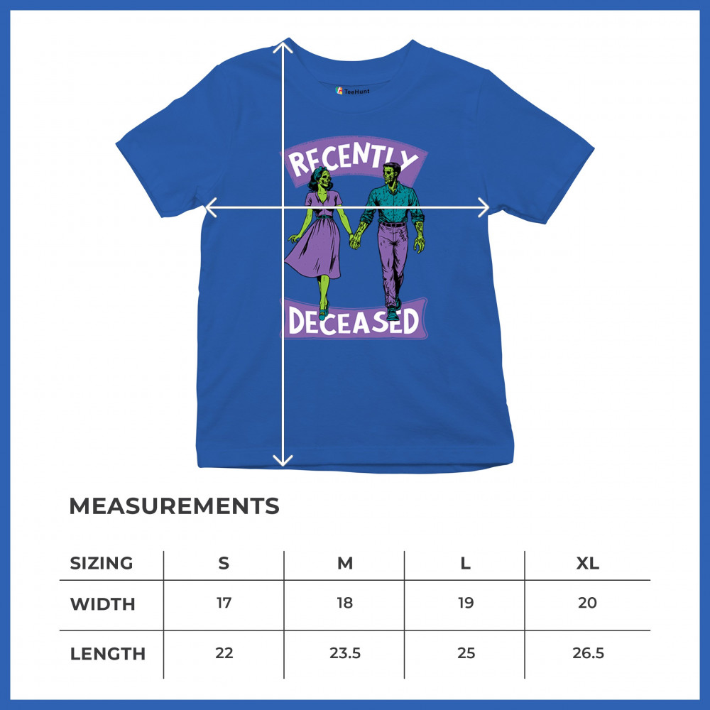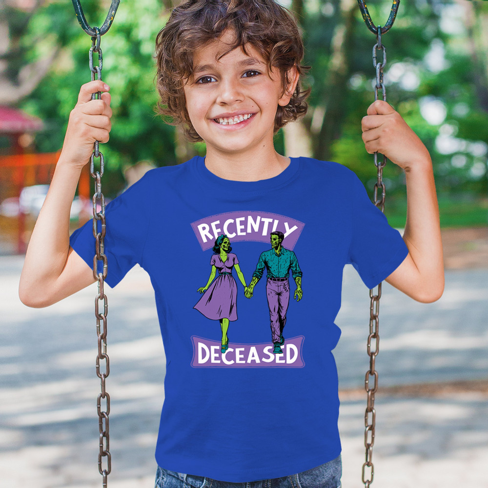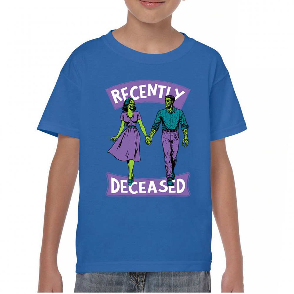 Recently Deceased zombie couple shirt with undead lovers design, spooky season humor, Halloween zombie outfit, and haunted house vibes.