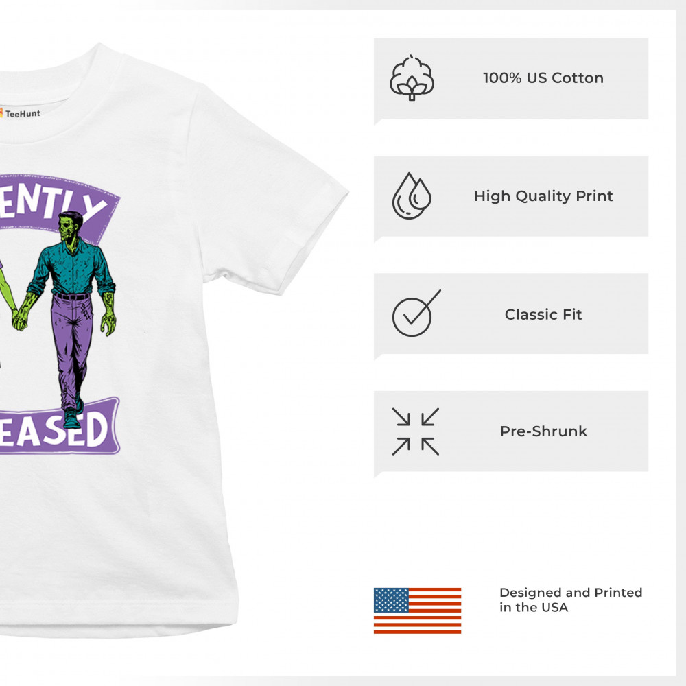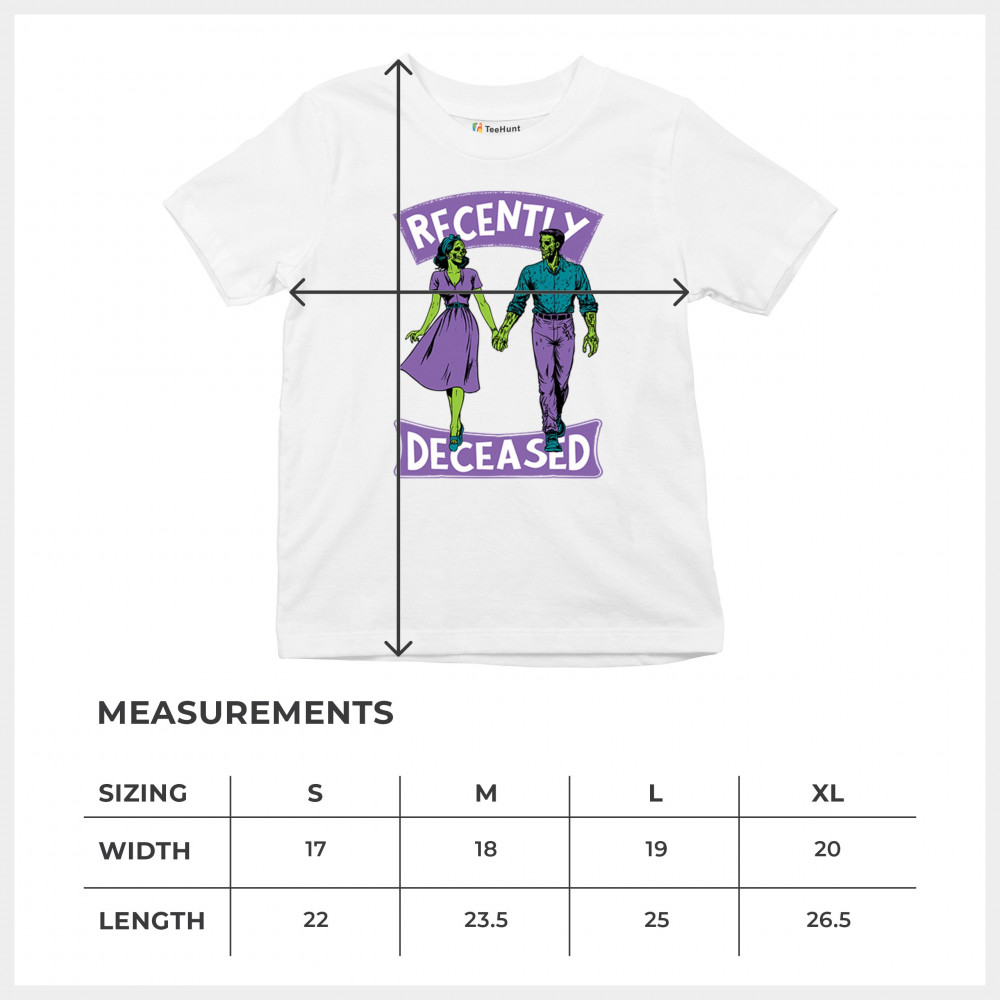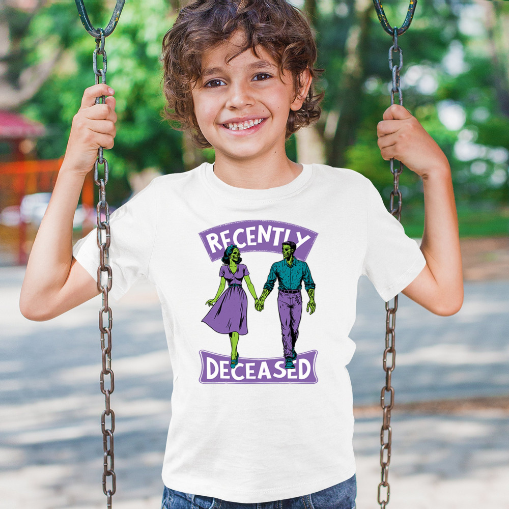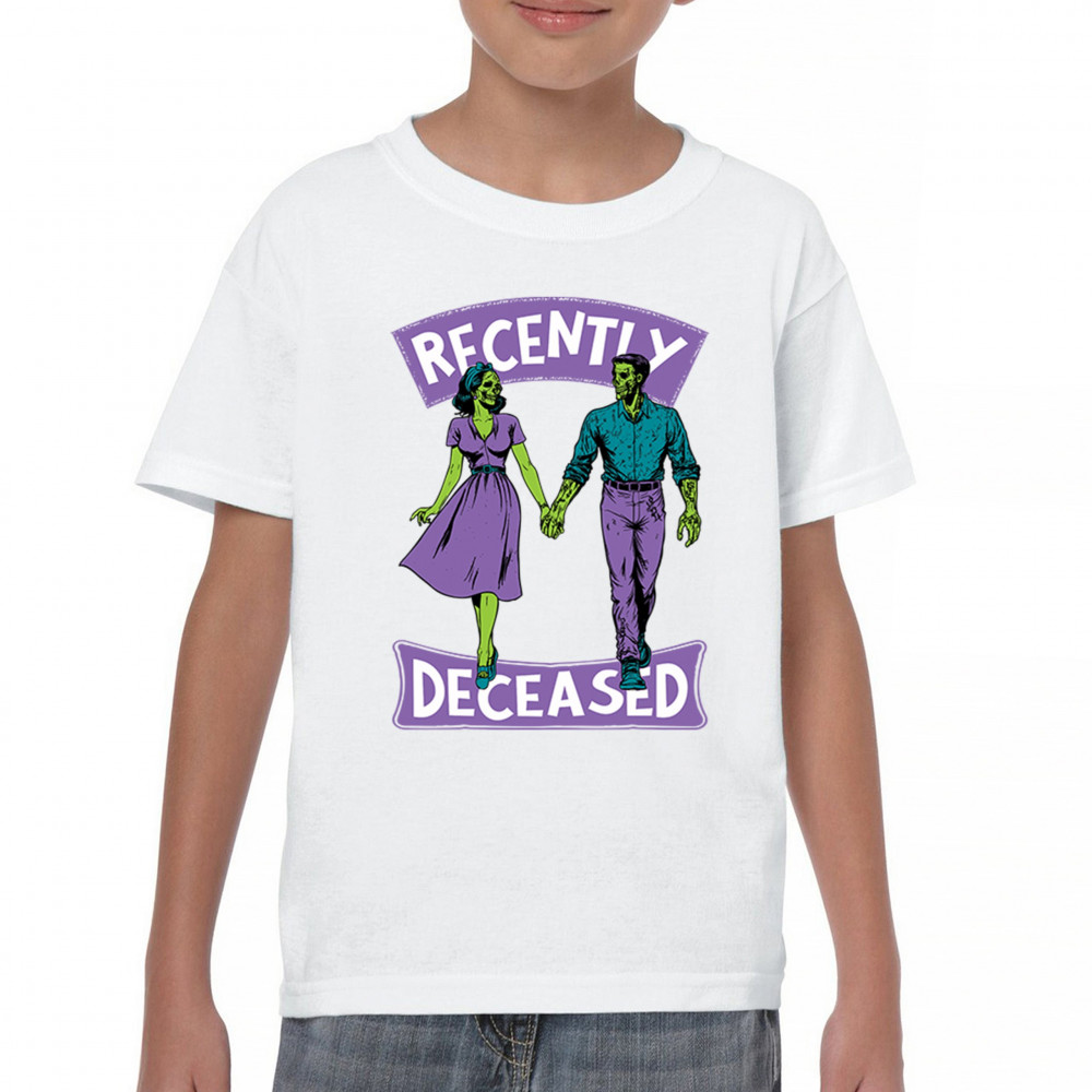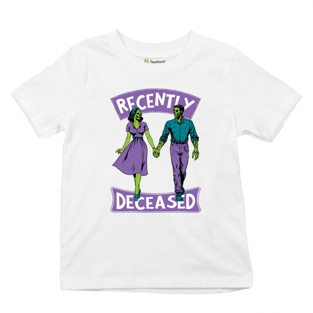 Recently Deceased zombie couple shirt with undead lovers design, spooky season humor, Halloween zombie outfit, and haunted house vibes.