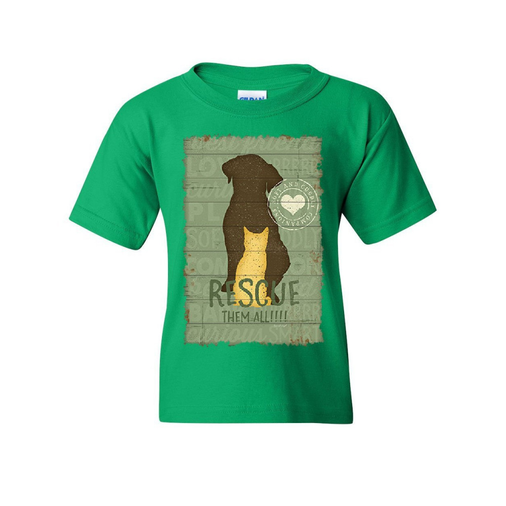 RESCUE THEM ALL youth t-shirt animal shelter dog cat paw kitten puppy kids tee green