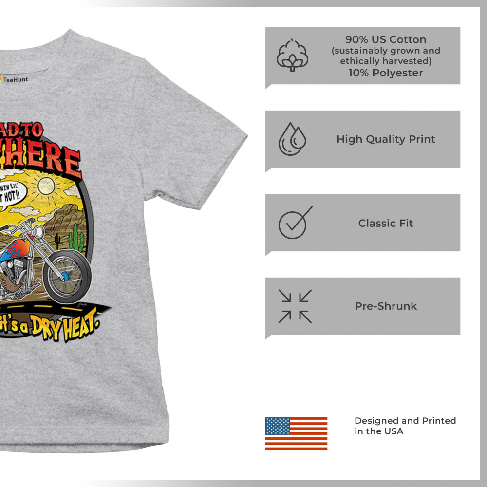 Our 'Road to Nowhere' tee is a salute to the thrill-seekers and the heat-bravers. Adorned with a bold skeleton cruising down Route 66, it embodies the spirit of adventure with a touch of playful defiance. A statement piece for anyone who lives for the ride and laughs in the face of danger. Join the ride into the sunset with this daring design.