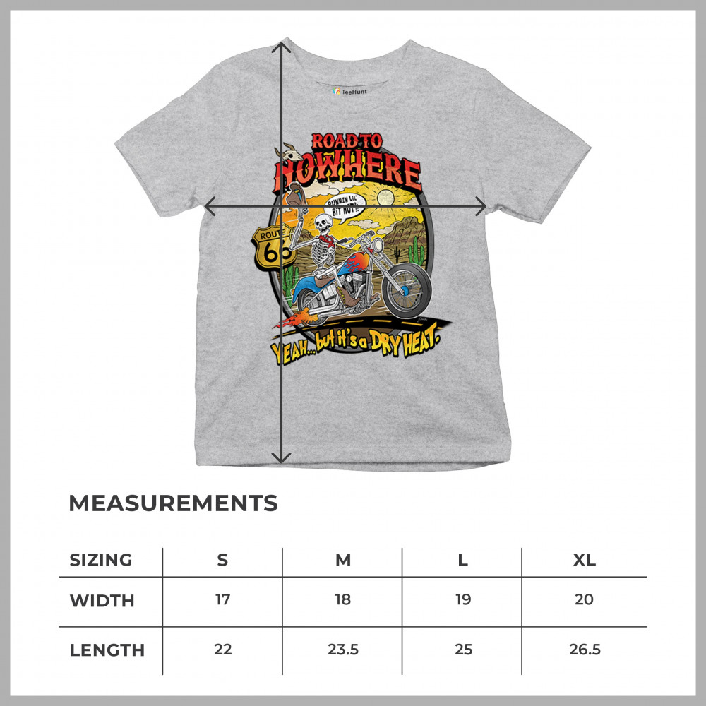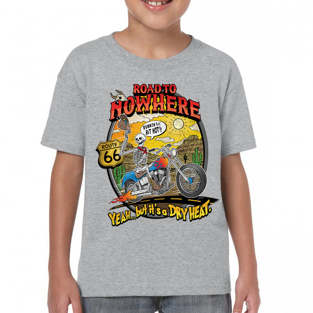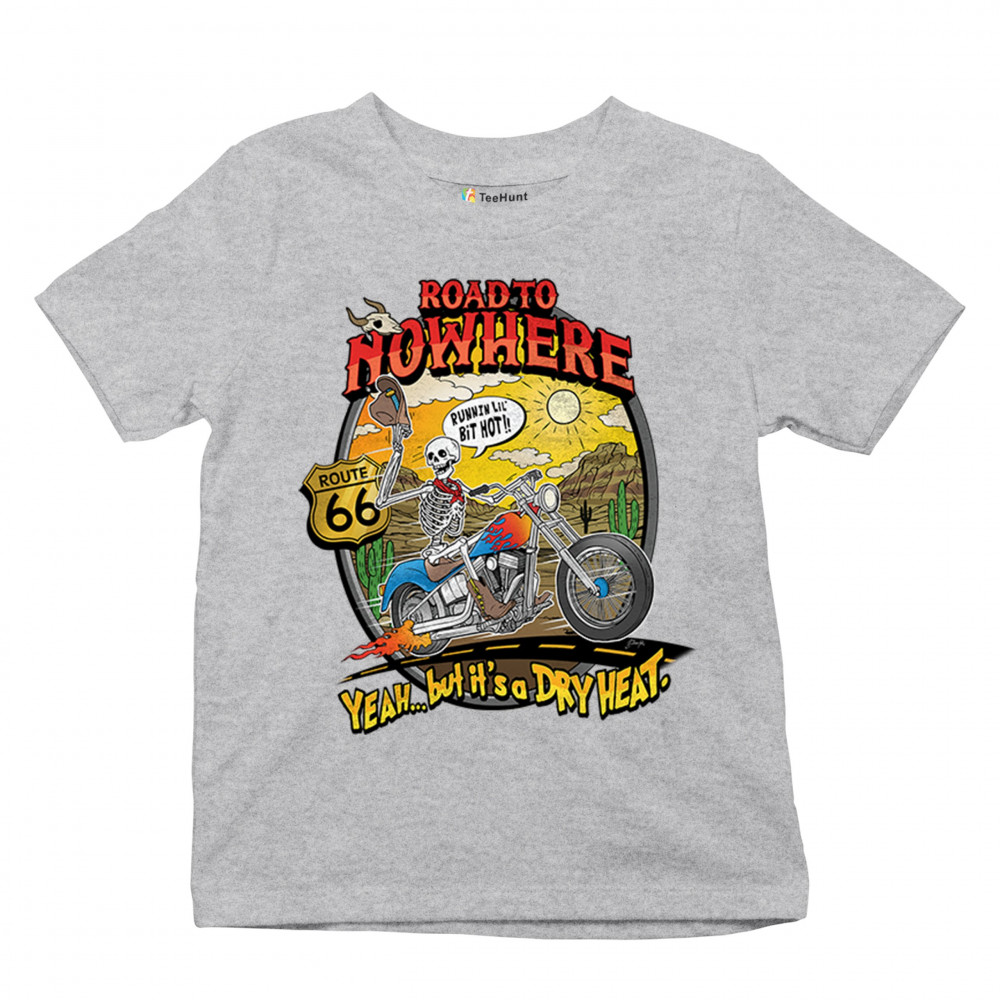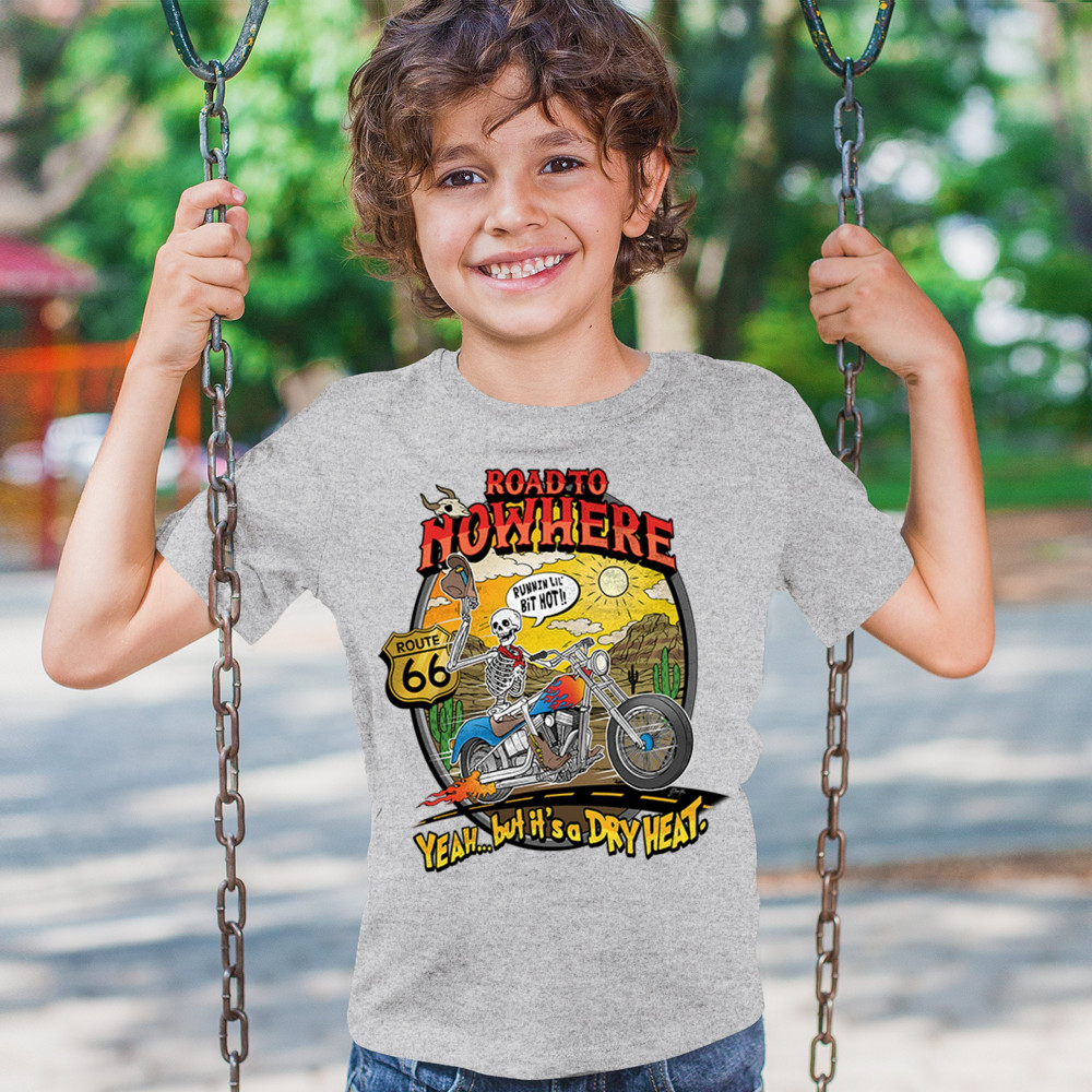 Discover the 'Road to Nowhere' T-shirt: a blend of bold graphics and adventurous spirit. Embrace the ride with our Route 66 skeleton biker design.