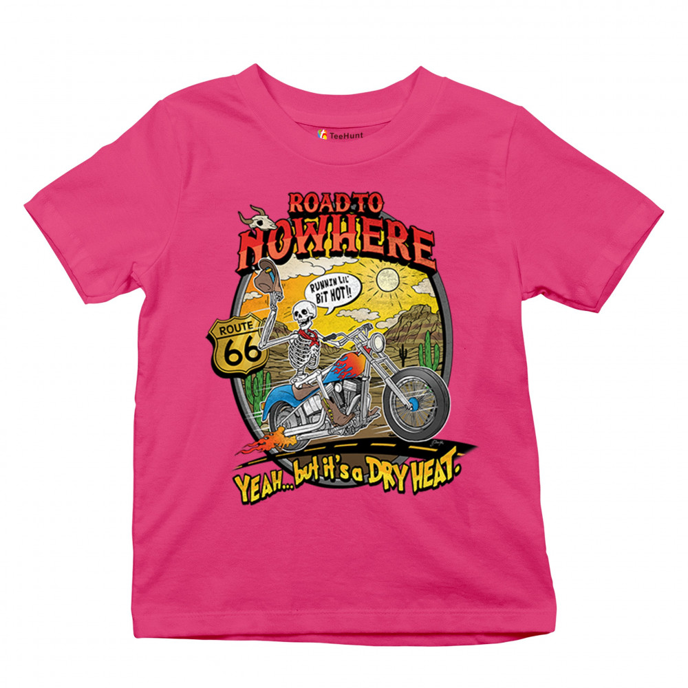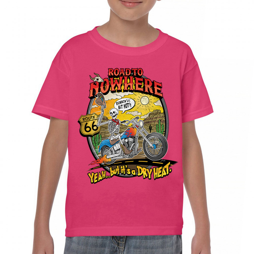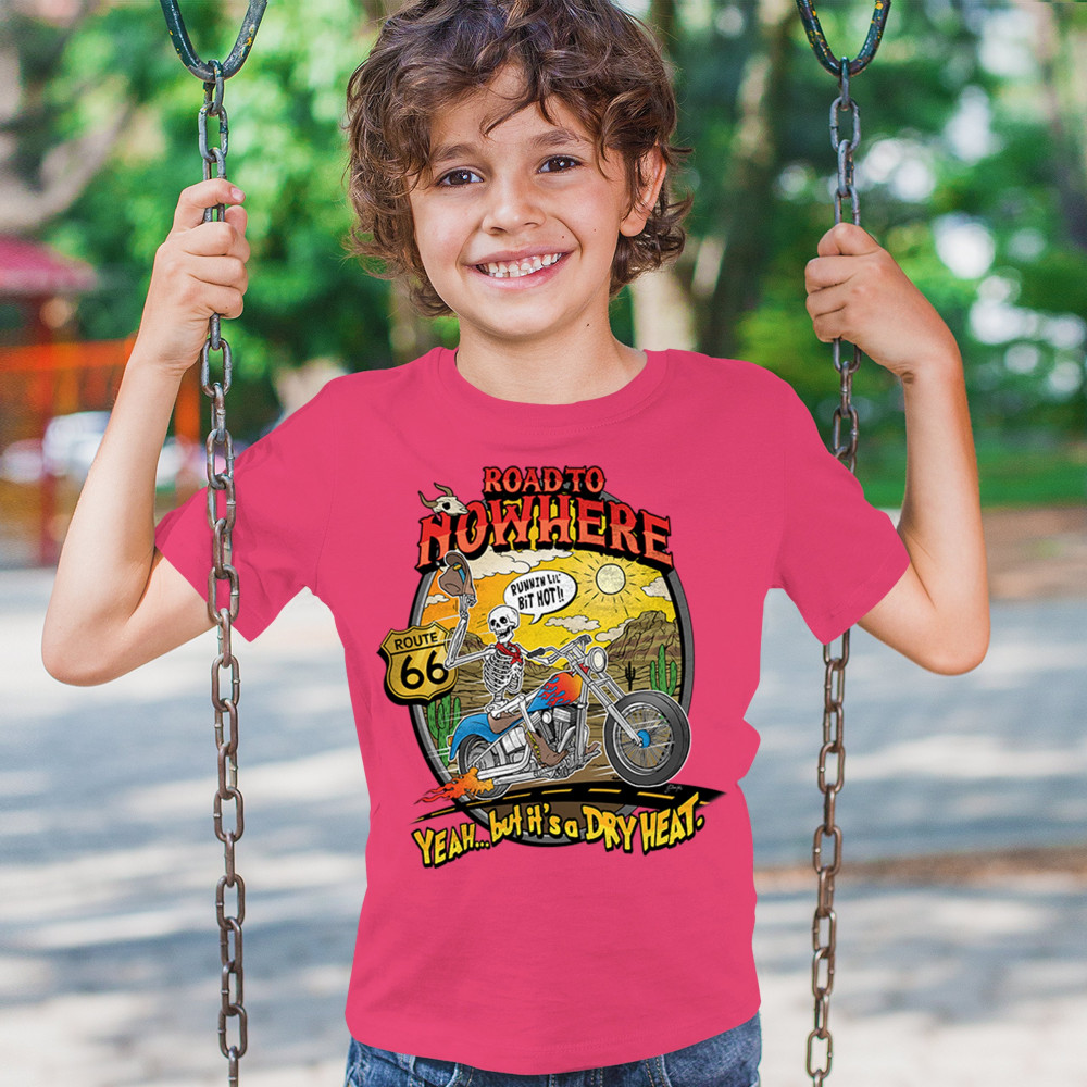 Discover the 'Road to Nowhere' T-shirt: a blend of bold graphics and adventurous spirit. Embrace the ride with our Route 66 skeleton biker design.