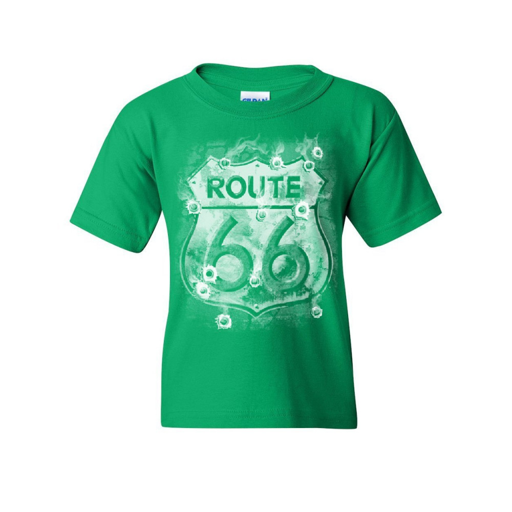 ROUTE 66 SIGN WITH BULLET HOLES route 66 youth t-shirt bullet holes the mother road american highway kids tee green