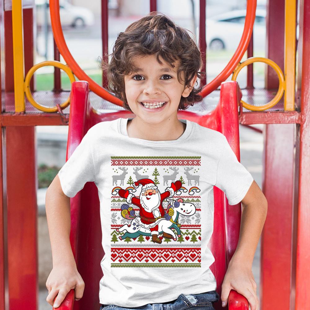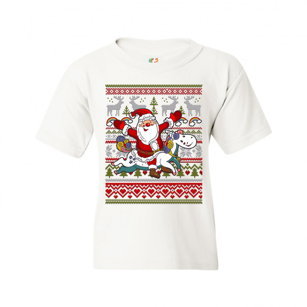 SANTA CLAUS RIDING A UNICORN youth t-shirt merry christmas ugly sweater kids white