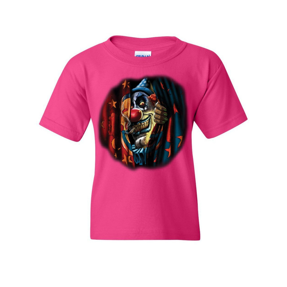 SCARY CIRCUS CLOWN youth t-shirt insane creepy clown evil mad horror kids tee pink