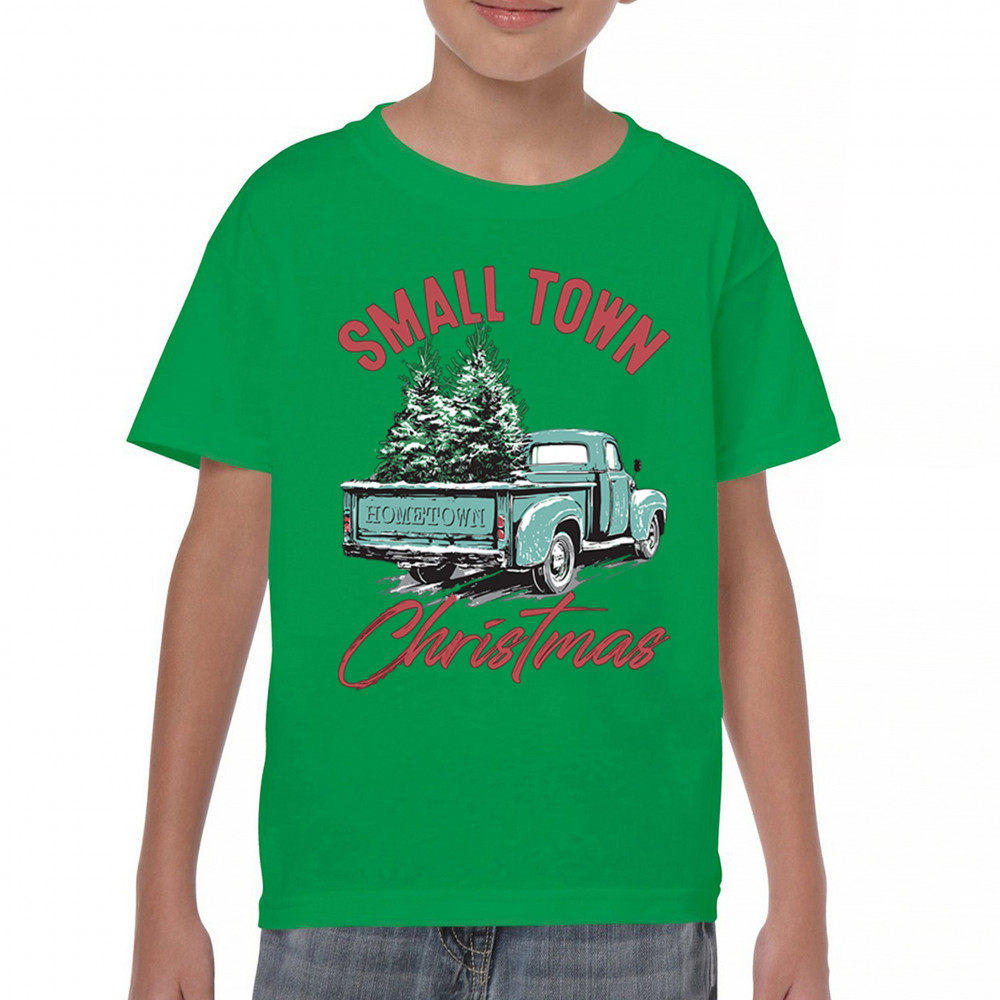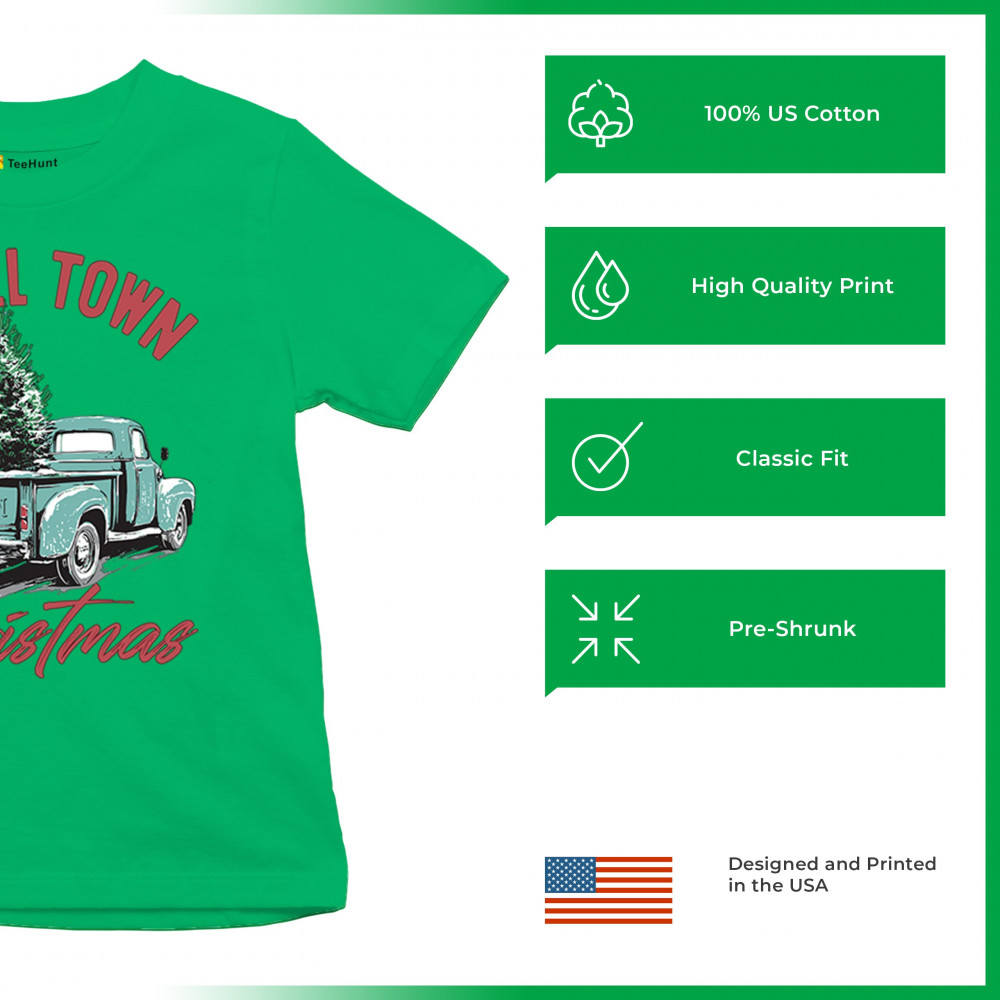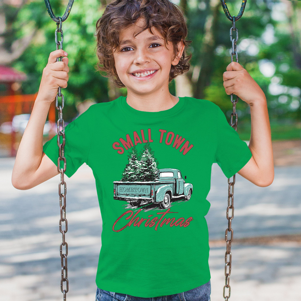 Embrace holiday nostalgia with this "Small Town Christmas" design featuring a vintage truck and Christmas trees. Perfect for rustic decor lovers.